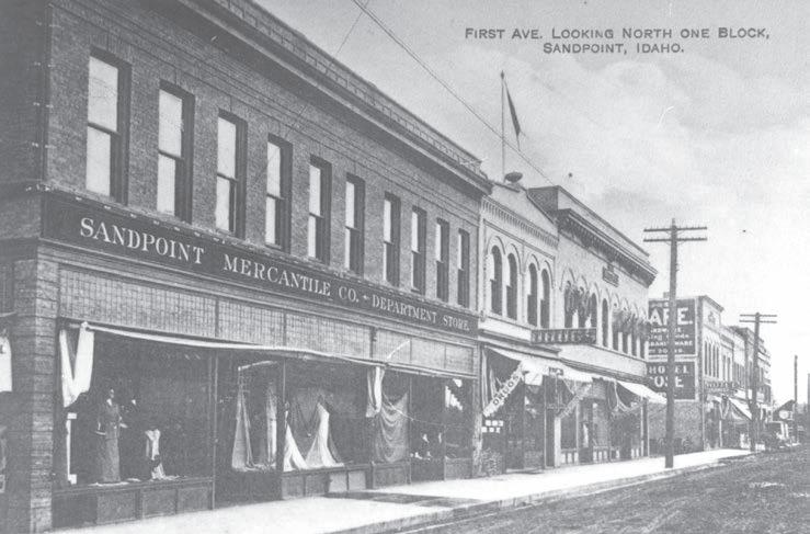 Looking north down First Avenue, from the intersection of First and Main Street. The building on the corner was the Sandpoint Mercantile Co. Dept. Store.