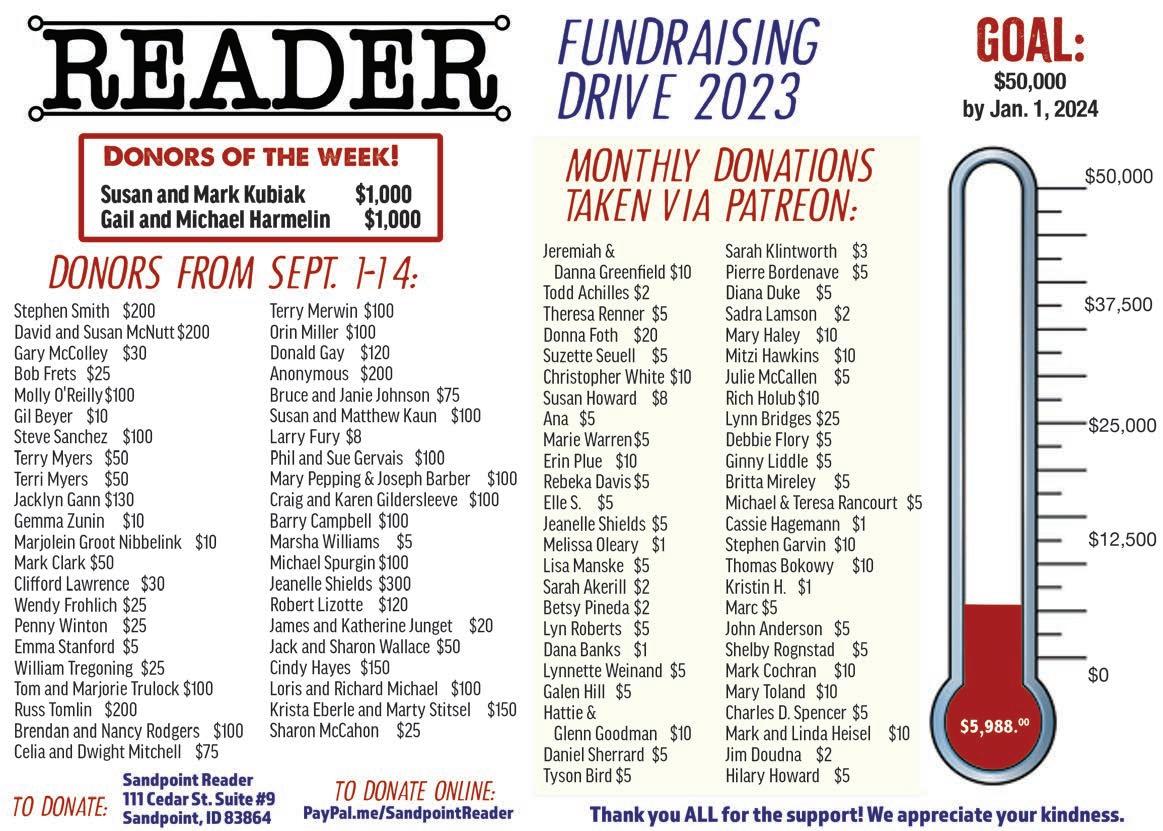 To all of those generous souls who have donated to the Reader since our Sept. 7 edition, we are so grateful for your support. This community continually amazes me. I’m going to publish a meter showing our progress toward raising $50,000 in every edition (to check out our progress from the beginning of September, as well as a list of donors, please see Page 16). I intend to publish the names of those who contribute to our fundraiser, so please indicate if you’d like to remain anonymous.