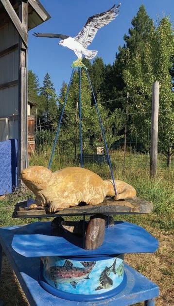 Finally, Harris’ piece, “At Rivers Edge,” features a base of hand-painted fish on up-cyled metal, topped with rocks found in Idaho and an otter carved from European granite atop a piece of Washington basalt. A fabricated osprey flies above the sculpture, held aloft on three blue-painted poles.