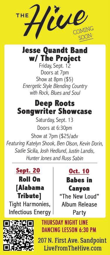 Some of North Idaho’s favorite stars will take the stage Saturday, Sept. 13 for the second annual Deep Roots: Sandpoint’s Original Songwriter Showcase at the Hive (207 N. First Ave.). The 21+ concert begins at 7 p.m. and will feature familiar names in the Sandpoint music scene: Katelyn Shook, Josh Hedlund, Kevin Dorin, Hunter Jones, Ben Olson, Russ Sabin, Justin Landis and Sadie Sicilia.