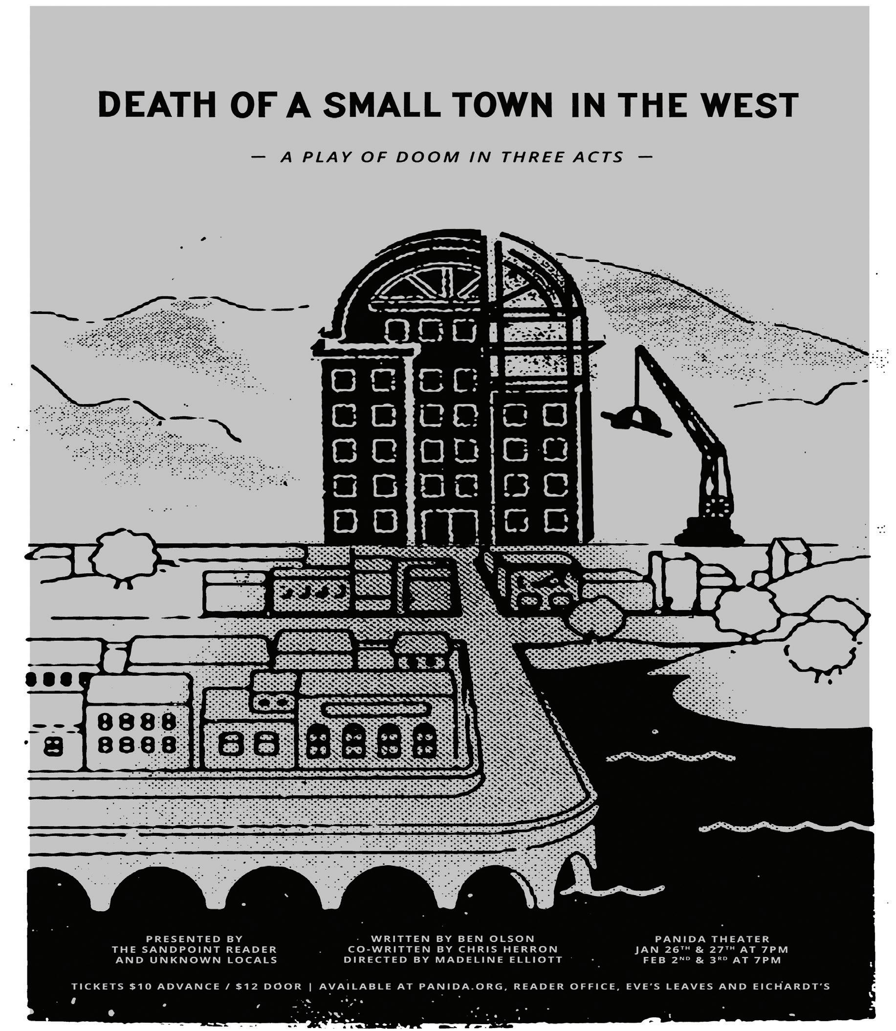 Speaking of explosives, this is the last shameless plug I’ll give for my play, “Death of a Small Town in the West,” which shows at the Panida Theater’s main stage this weekend, Jan. 26-27. Tickets are only $10 if you buy them in advance (at Eichardt’s, Eve’s Leaves or online at Panida.org), or $12 if you want to buy them at the box office. A portion of the proceeds will benefit the Sandpoint Reader and local theater production company Unknown Locals. I look forward to seeing you there this weekend, or, if you can’t make it then, “Death” will play again next weekend – Feb. 2-3.