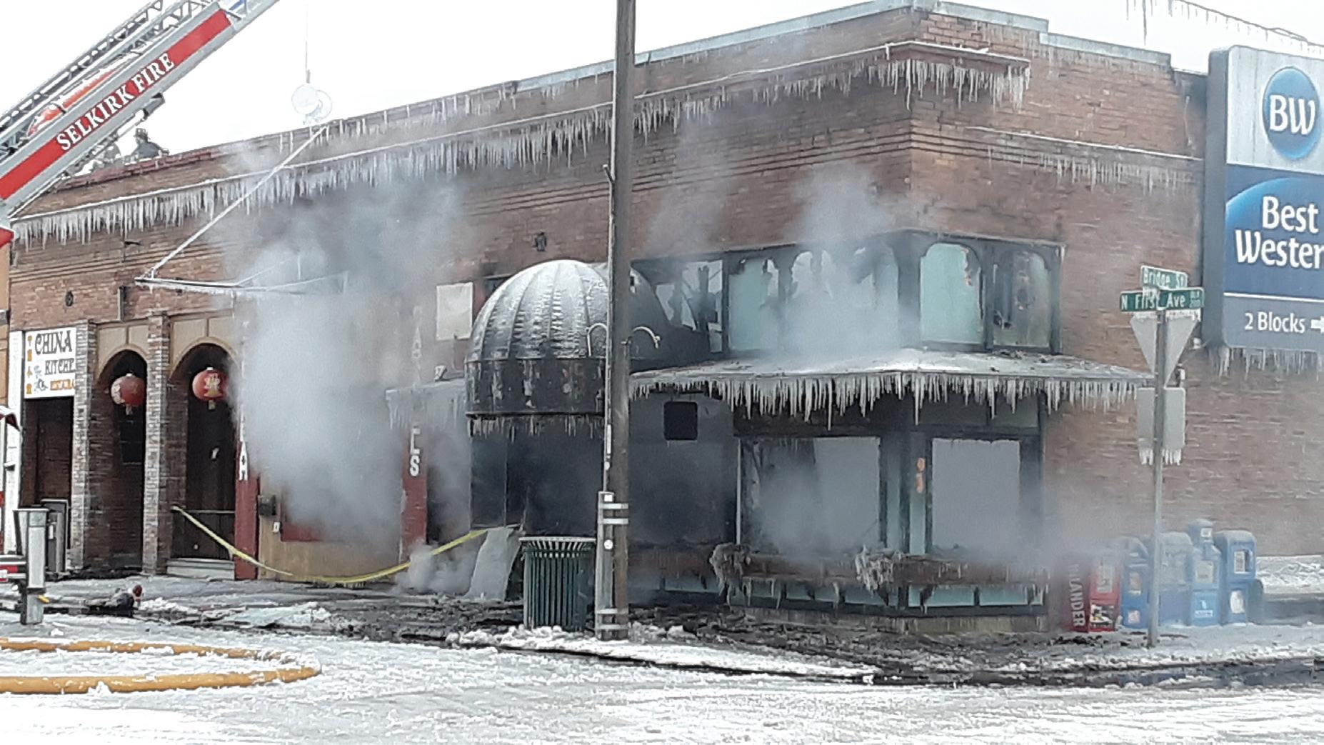 The building at First Ave. and Bridge St. in mid-February after it had caught fire hours earlier. Photo by Ben Olson.
