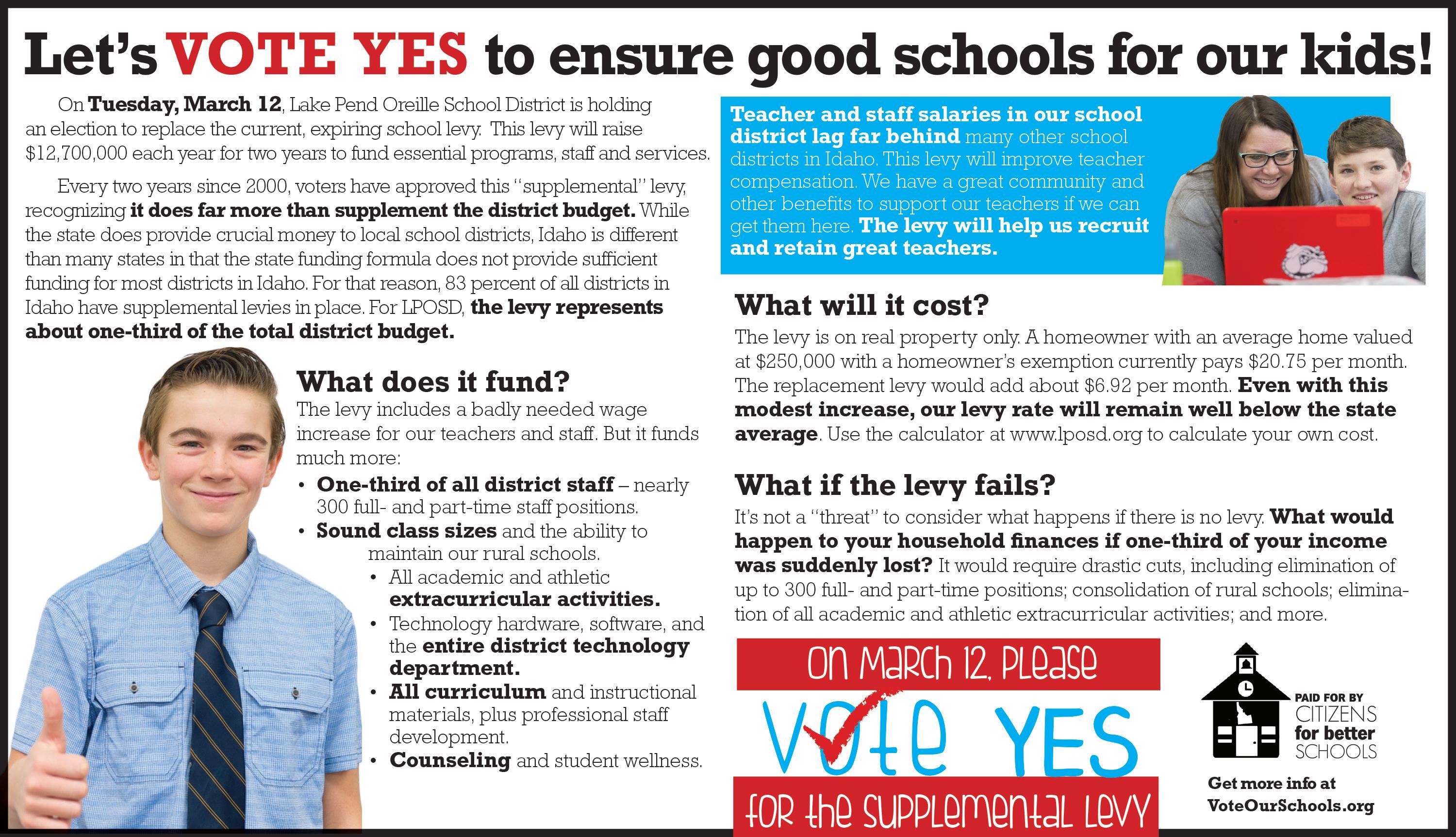 There is also a vote coming up March 12 for the Lake Pend Oreille School District supplemental school levy. Starting this week, we’ll be featuring some opinion editorials from various voices in the community, including a “point/counterpoint” piece in a later issue where proponents of both sides of the argument will square off in a winner-take-all cage match. Just kidding, no cage match, but they’ll duke it out with words, which are even more powerful.