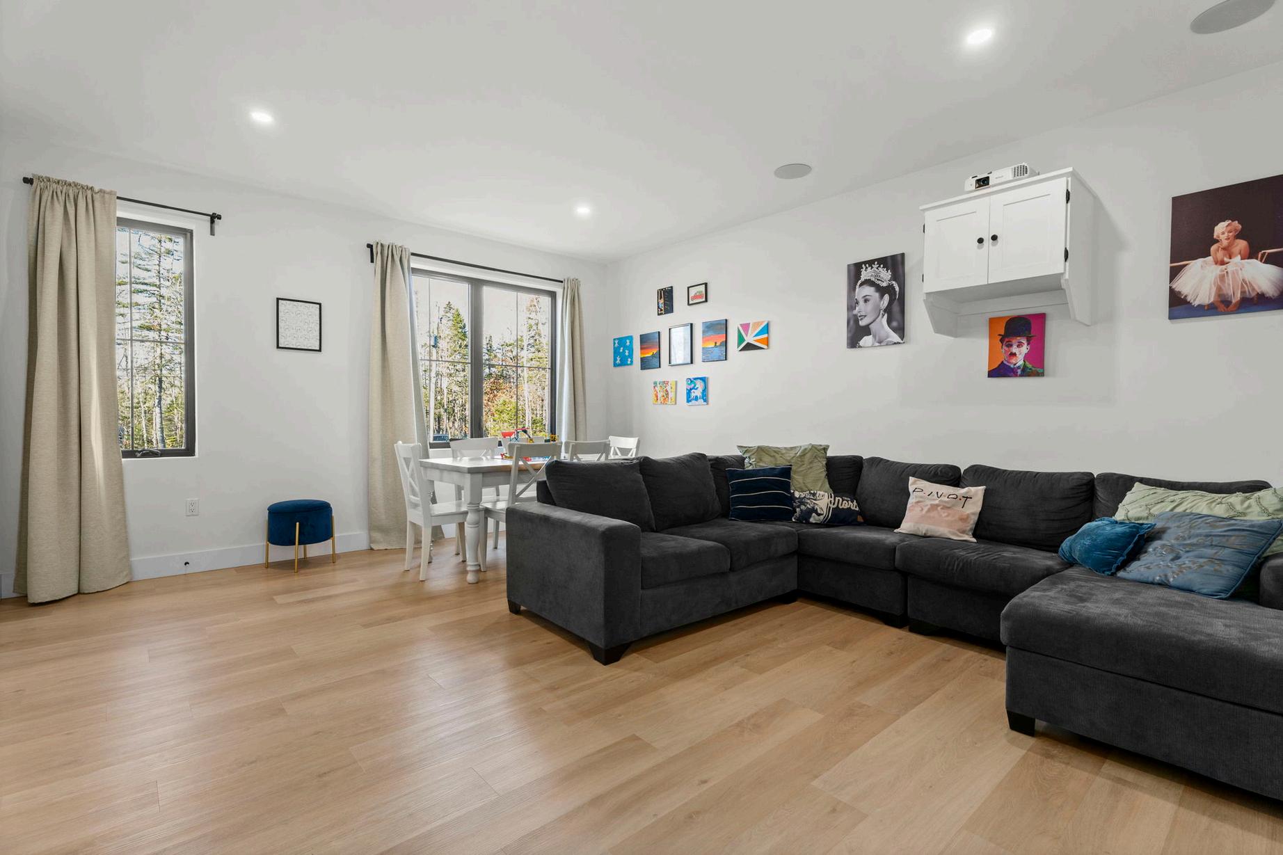 Natural light floods the space from every angle, enhanced by the home’s southern exposure The adjoining rec room provides flexibility perfect as a media lounge, art studio, or playroom. With its projector setup and surround sound, this space easily transforms from a cozy retreat to an entertainment hub, adaptable for every lifestyle.