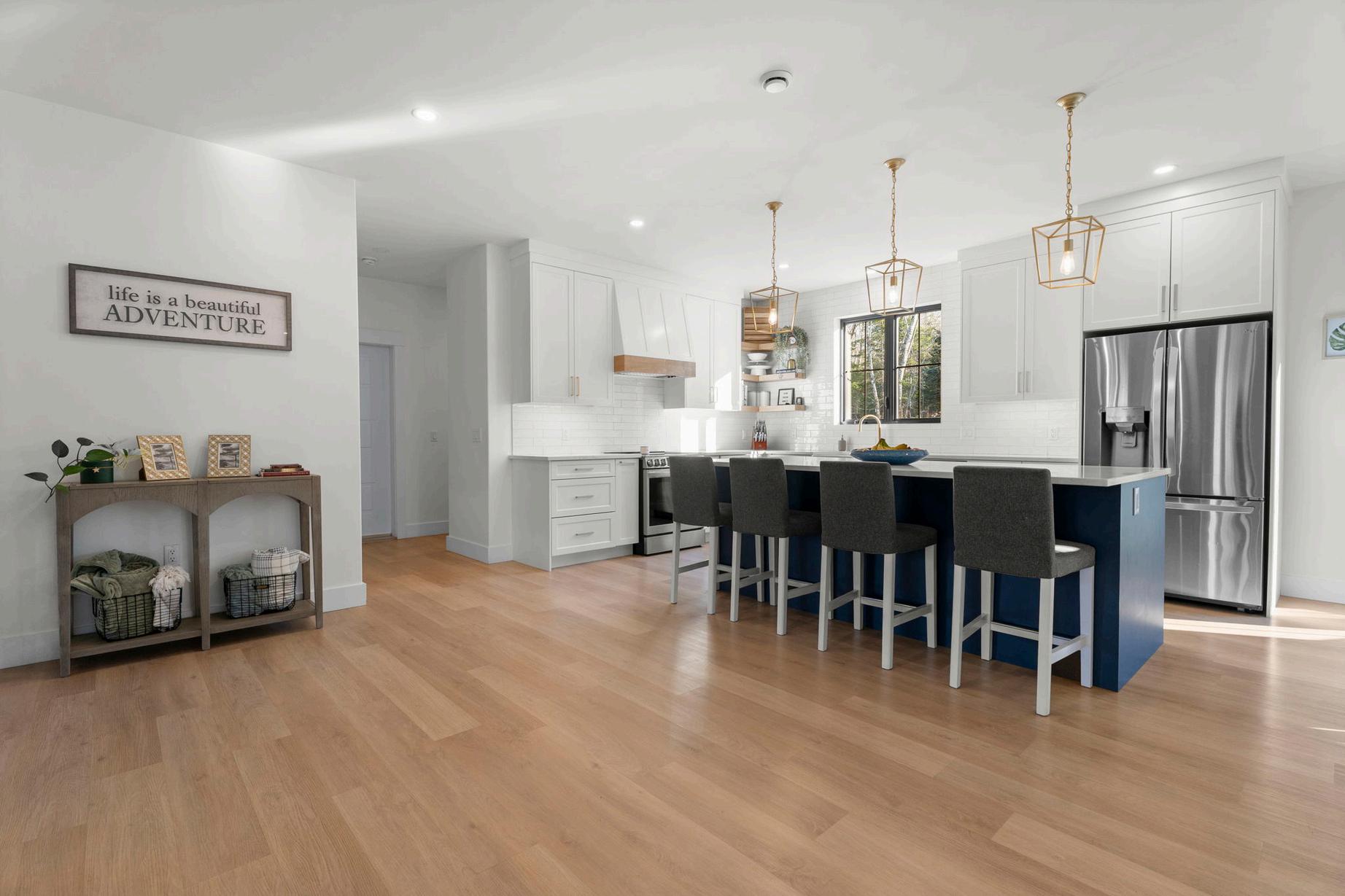 Polished quartz countertops sweep across the workspace, offering durability and eleganceinequalmeasure.Thespacious4x8islandinvitesfamilyandfriendstogather comfortably for morning coffee or casual dinners, while thoughtful details like softclosecabinetryandunder-cabinetlightingensureeffortlessliving