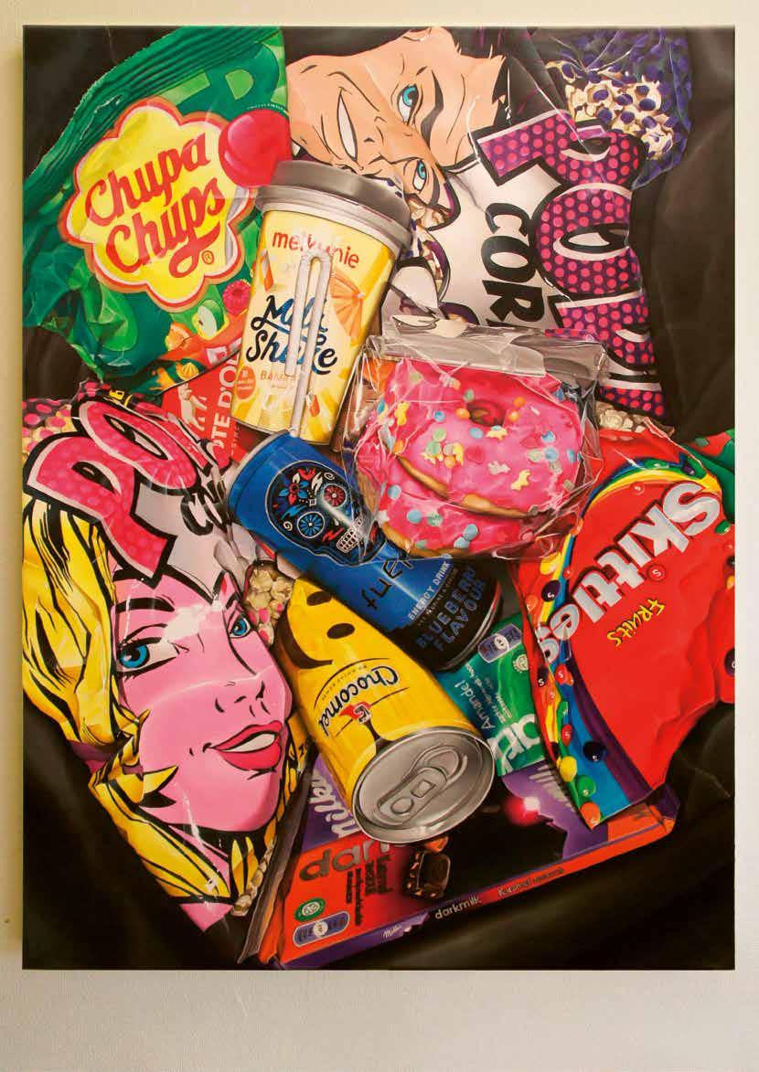 Originele tekeningen, tot twintig bij dertig centimeter, maar ook riso prints op een groter formaat. Sinds 2015 heb ik aan veel groepsexposities meegedaan. Ik benader zelf geen galerieën, maar word telkens gevraagd om mee te doen. Soms is er een thema, maar in de meeste gevallen ben ik vrij om aan te leveren wat ik wil. In galerie Feinkunst Krüger in Hamburg doe ik mee aan de jaarlijkse groepsexpositie voor lowbrow kunst: Don’t Wake Daddy.