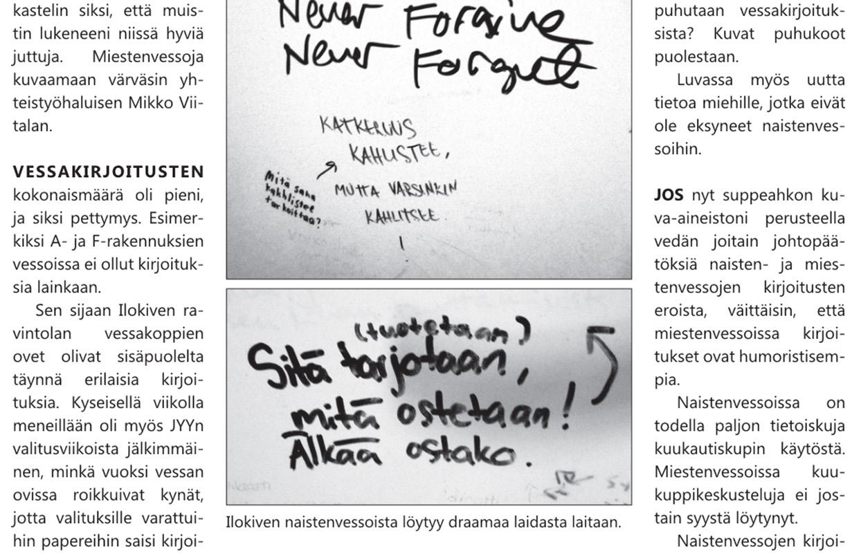 Aiheesta innostuneena toimitus käväisi tsekkaamassa Fennicumin miesten vessan kirjoitukset, ihan vain että onko laatu tallella. Ja olihan se. (2/2022)