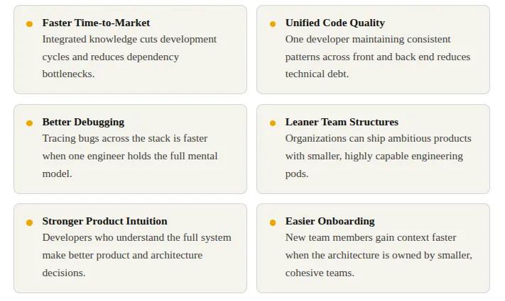 Theexpenseofmiscommunicationbetweenspecializedteamsbecomes excessiveinlargeorganizations.Fullstackdevelopersactastheirown translators,whichhelpsthemdecreasefrictionwhilemaintaining developmentprocessalignment.