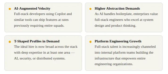 Modernenterprisearchitectures microservices,serverless,event-driven systems requireengineerswhopossesstheabilitytothinkbeyond individualservices Fullstackdevelopersbringthisholisticsystemsthinking naturally.