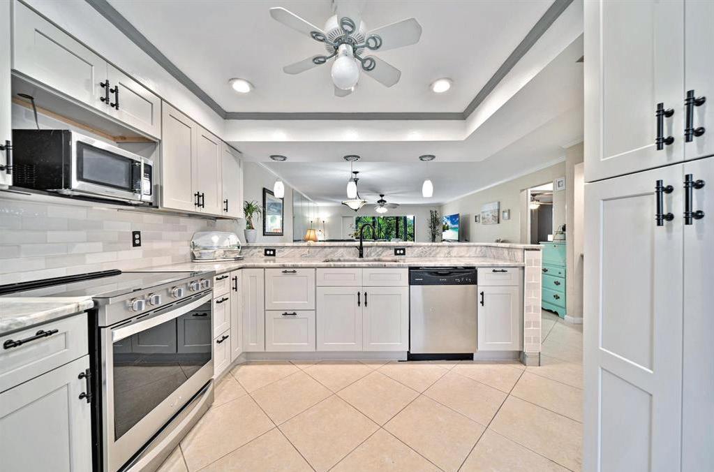 Ready for occupancy! Custom renovation with luxury cabinetry, flooring, appliances, furniture, & new HVAC. Hurricane impact glass, plantation shutters, sunshades.