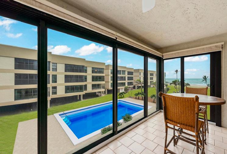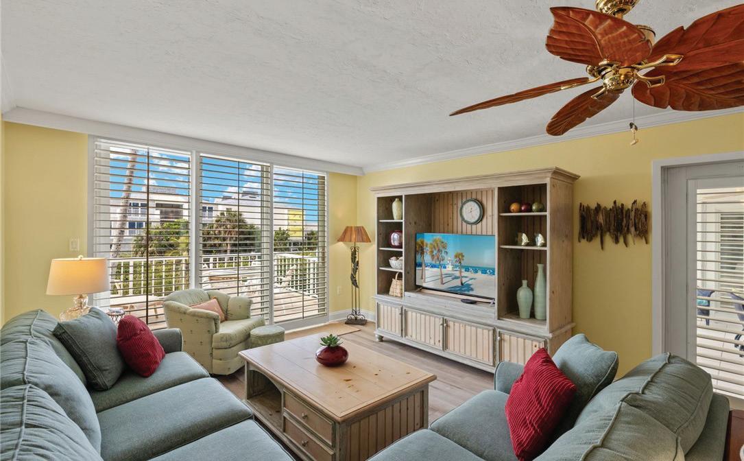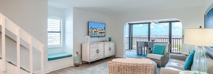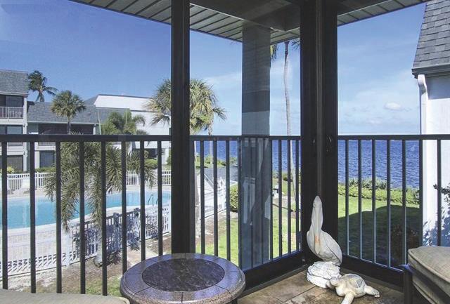 Bay‐view 2nd floor 2‐bedroom remodeled split‐plan w/enclosed balcony expanding living space. Unique corner loca�on w/ extra privacy as no upper unit & entry deck serves just this one. $429K furnished