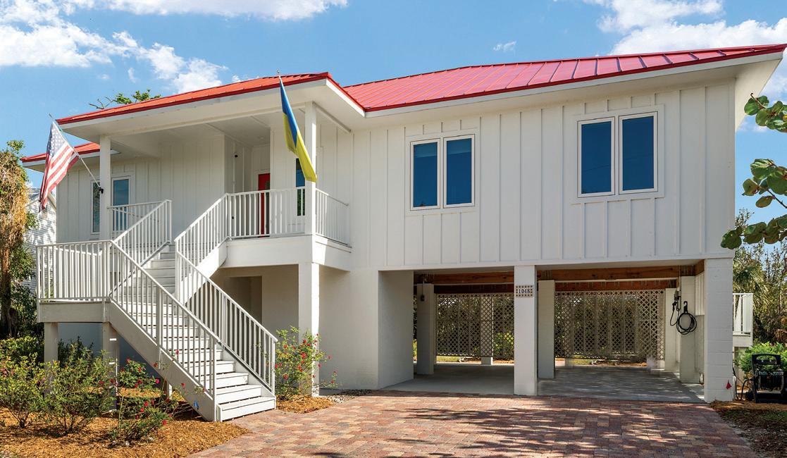 Beautiful, strong, elevated! This striking Key West style home has a relaxed & inviting feel with its open plan, high ceilings, and wraparound verandas. Lots of natural light showcases the quality finishes throughout. 3 bedrooms, 2.5 bath, split bedrooms with spacious primary suite, plus laundry room, elevator & loft with 2 home o ces. Located in the Dunes with deeded beach access, & permitted for a future pool. Impact windows & doors, metal roof, & Hardi Board siding, Flood insurance available.