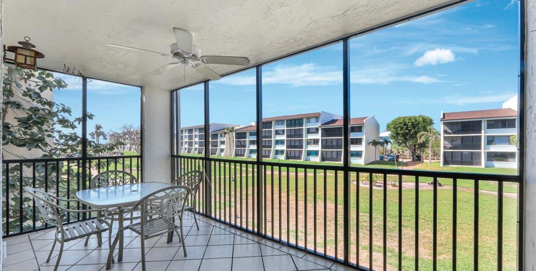 Just‐remodeled top‐floor 2 bedroom w/ river to golf course view & gulf views from bedrooms. Assigned garage & storeroom below. Ac�ve clubhouse w/ pool & beach across street. $599K