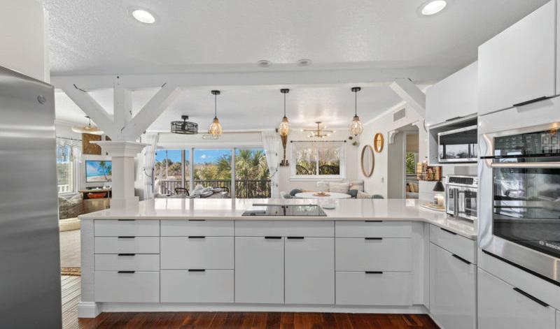 Elevated 3‐bedroom home w/central great room & gourmet kitchen. On cul‐de‐sac, close to beach path. Community pool & tennis up street. Full storage floor w/2 garage bays below. $885K