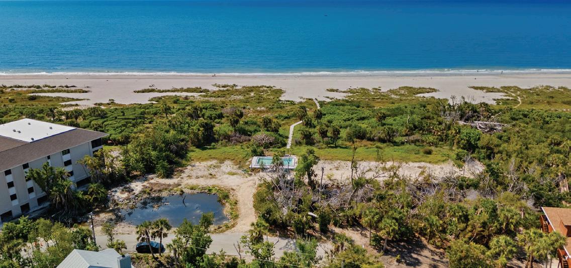 on nearly an acre between twin ponds and bordered by conservation land, this private Sanibel compound features a 3BR main house, separate 1BR guest house, large pool, and deeded beach access. Tranquil, spacious, and a short stroll from the sand. Reduced to $1,200,000.