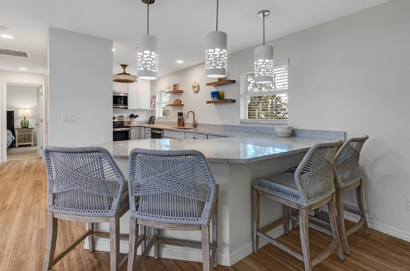 Residen�al Condo With Garage Sunset South #7D—Remodeled top‐floor 2 bedroom with river to golf course views plus gulf views from bedrooms. Assigned garage & storeroom below. Engaged owners with clubhouse, pool & beach across street. $599K