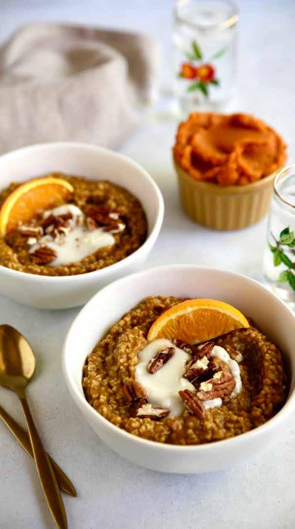 Simmer uncovered for about 20–25 minutes, stirring occasionally until the oats are tender, and creamy. Stir in the sweet potato purée, sea salt, cinnamon, and ground cardamom. Cook for 2–3 more minutes to heat through. Spoon the oatmeal into bowls. Top each serving with fresh orange slices, and coconut butter. Garnish with pecans.