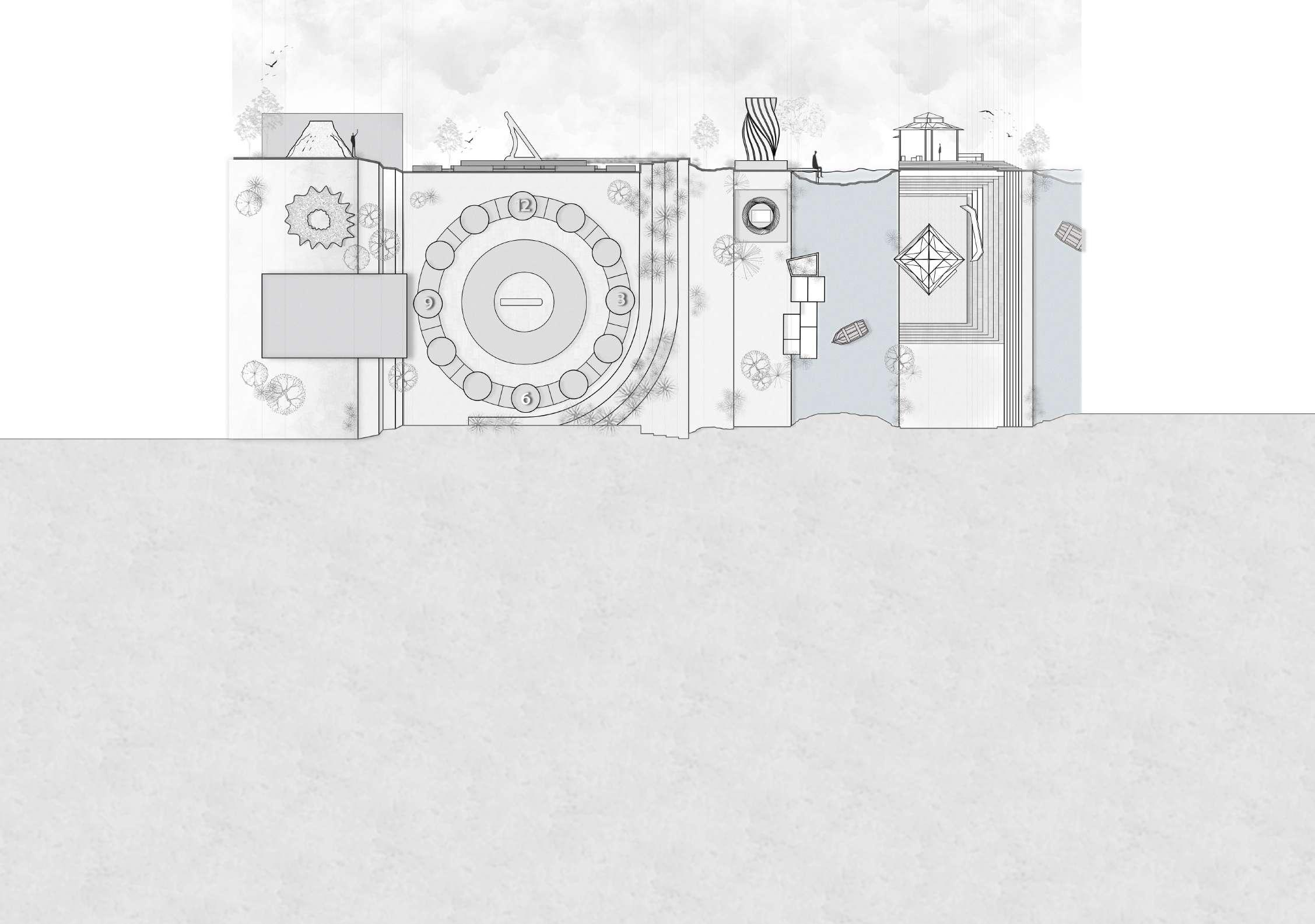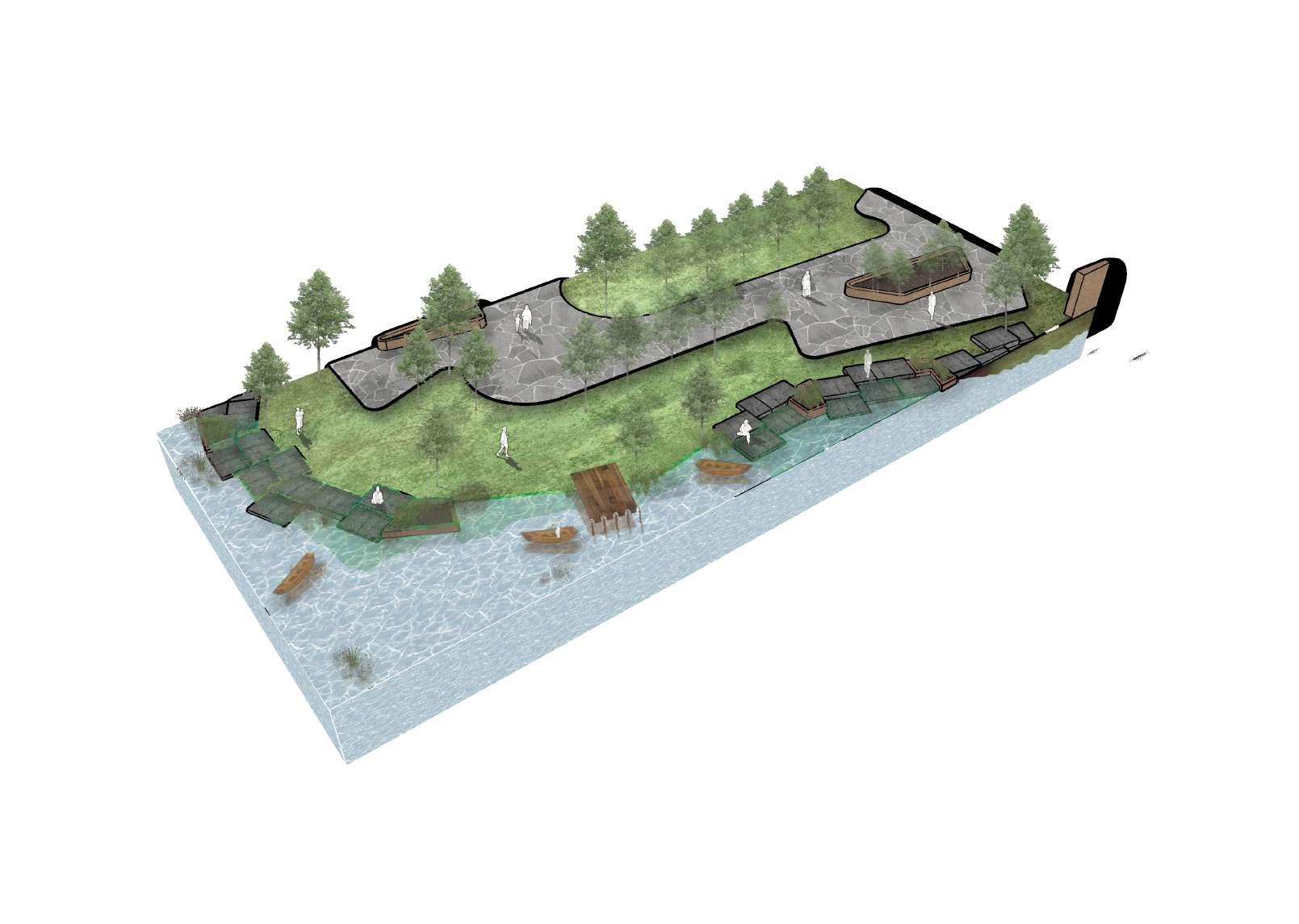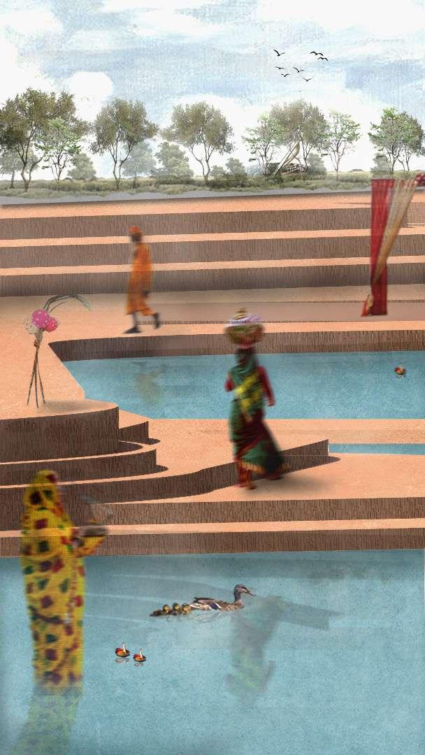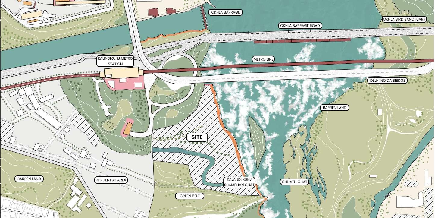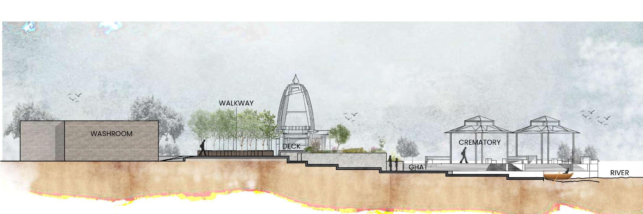 The Chhath ghat in Noida is designed to honor the Chhath pooja tradition and uplift the Yamuna River. The intervention works to rejuvenate as well as increase the co- habitability of the space by introducing 5 distinct zones which cater to various aspects of the design problem. The ghat area is for celebrations, the sundial zone offers a historical walk, the wetland system reduces pollution and provides an interactive experience, raingardens offer respite, and the crematorium design enhances the existing facility.