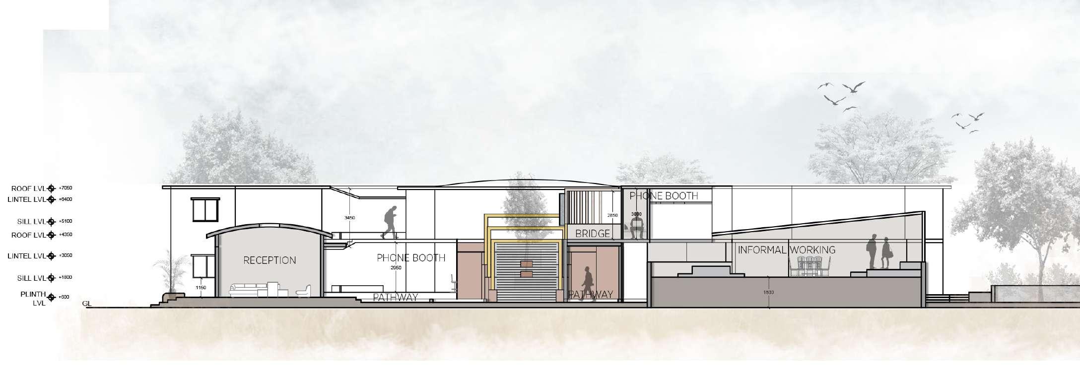 MISCELLANEOUS 06 SELECTED WORKS | 2022-24 SANKET BHAVSAR | 36 ACADEMICS NLSIU DIRECTOR'S CABIN ALL DIMENSIONS ARE IN M SCALE :25 PROPOSED TITLE THE PROPOSED PLAN IS FOR THE INTERIOR PROJECT FOR THE DIRECTOR'S CABIN OF NATIONAL LAW SCHOOL OF INDIA UNIVERSITY, BANGLORE SECTION BEAM LEVEL (+3.90) SLAB LEVEL (+4.20LVL) 0.60 0.30 2.70 0.60 0.60 0.30 FLOOR LEVEL (+00LVL) LINTEL LEVEL (+2.70LVL) FALSE CIELING LEVEL (+3.30LVL) BEAM LEVEL (+3.90) SLAB LEVEL (+4.20LVL) 0.30 X 0.30 RCC BEAM HANGERS 24W LED STRIP 25MM THICK GYPSUM CONC. FINISH BOARD 1800 LM LED RECESSED PANEL 2200 LM LED BATTEN 0.215 X 0.065 X 0.017 EXPOSED BRICK CLADDING PARAMETRIC WALL ART 10MM THICK LAMINATED GLASS 10MM THICK ETCHED GLASS METAL FRAME 15MM THICK GROOVE CONCRETE FINISH TEXTURE 100MM THICK KOTA STONE SKIRTING 25MM THICK KOTA STONE FLOORING 0.60 0.30 X 0.30 RCC BEAM HANGERS 25MM THICK GYPSUM WOODEN FINISH BOARD 25MM THICK GYPSUM WOODEN SECTION AA' THESE DRAWING AR. SANKET BHAVSAR USEDOR REPRODUCED PERMISSION NLSIU DIRECTOR'S ALL DIMENSIONS NAME SANKET BHAVSAR ENROLLMENT NO. INTERIOR DESIGN DEPARTMENT OF PROPOSED TITLE THE PROPOSED PLAN PROJECT FOR THE NATIONAL LAW SCHOOL UNIVERSITY, BANGLORE SECTION FLOOR LEVEL (+00LVL) SILL LEVEL (+0.40LVL) LINTEL LEVEL (+2.70LVL) FALSE CIELING LEVEL (+3.30LVL) BEAM LEVEL (+3.90) SLAB LEVEL (+4.20LVL) 0.40 2.30 0.60 0.60 0.30 2.70 0.60 0.60 0.30 FLOOR LEVEL (+00LVL) LINTEL LEVEL (+2.70LVL) FALSE CIELING LEVEL (+3.30LVL) BEAM LEVEL (+3.90) SLAB LEVEL (+4.20LVL) 0.30 X 0.30 RCC BEAM HANGERS 24W LED STRIP 25MM THICK GYPSUM CONC. FINISH BOARD 1800 LM LED RECESSED PANEL 2200 LM LED BATTEN 0.215 X 0.065 X 0.017 EXPOSED BRICK CLADDING PARAMETRIC WALL ART 10MM THICK LAMINATED GLASS 10MM THICK ETCHED GLASS METAL FRAME 15MM THICK GROOVE CONCRETE FINISH TEXTURE 100MM THICK KOTA STONE SKIRTING 25MM THICK KOTA STONE FLOORING 0.60 0.30 X 0.30 RCC BEAM HANGERS 25MM THICK GYPSUM WOODEN FINISH BOARD 25MM THICK GYPSUM WOODEN FINISH BOARD SECTION AA' SECTION BB' 2100 LM LED RECESSED PANEL 2100 LM LED RECESSED PANEL METAL PARTITION PARAMETRIC WALL ART BAMBOO CURTAIN CONCRETE FINISH TEXTURE 15MM THICK GROOVE 100MM THICK KOTA STONE SKIRTING 25MM THICK KOTA STONE FLOORING 20MM THICK WOOD WALL PANEL 1.00 X 2.70 FLUSH DOOR DIRECTOR’S CABIN DESIGN