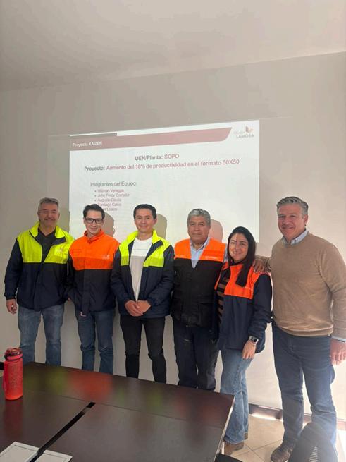 Reconocemos y felicitamos a Wilman Venegas, John Fredy Corredor, Augusto Dávila, Santiago Calvo y Luisa Loaiza, quienes lideraron el proyecto“Aumentodel18%deproductividadenelformato50x50”.Este proyecto fue evaluado con 20.000 puntos y permitió incrementar la productividad del horno 3 mediante la optimización de los tiempos de cicloyeltrabajosimultáneodeprensas.