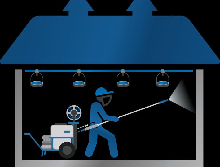 Wash walls, floors and if necessary, ceiling with a high pressure cleaner