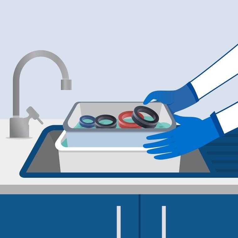 Remplissez un récipient avec le Sanosil SD1 et plongez y les pièces. Retirez les après quelques minutes et laissez les sécher. Tant que le Sanosil SD1 ne contient pas d'impuretés, la solution peut être utilisée plusieurs fois.