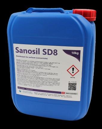 Sanosil SD8 ist ein Flächendesinfektionsmittel der neusten Generation mit schneller Wirkung. Es basiert auf einer Formulierung für mit verschiedenen oberflächenaktiven Substanzen verstärktem Wasserstoffperoxid und verfügt über ausgezeichnete Netzfähigkeit auch auf wasserabstossenden oder leicht fettigen Oberflächen (z.B. Hand und Fingerabdrücken). SD8 kann bis 1:4 mit Leitungswasser verdünnt werden und setzt keine brennbaren oder übelriechende Dämpfe frei.