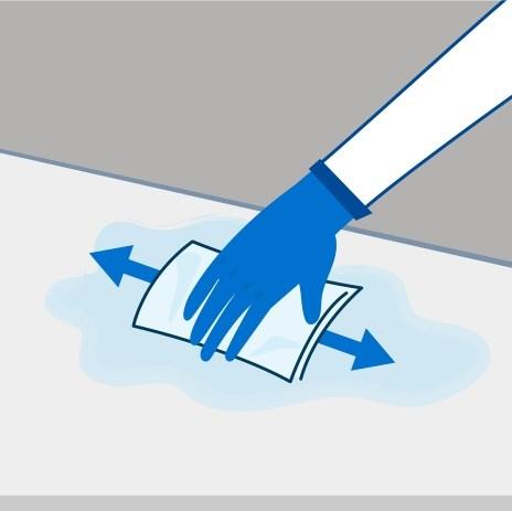 Benetzen Sie die zu desinfizierende Fläche mit dem Tuch, so dass ein gleichmässiger, lückenloser, feuchter Film zurückbleibt. Pfützenbildung vermeiden. Bleiben auf glatten Oberflächen Tropfen oder Pfützen zurück, verteilen Sie diese mit dem Wischtuch.