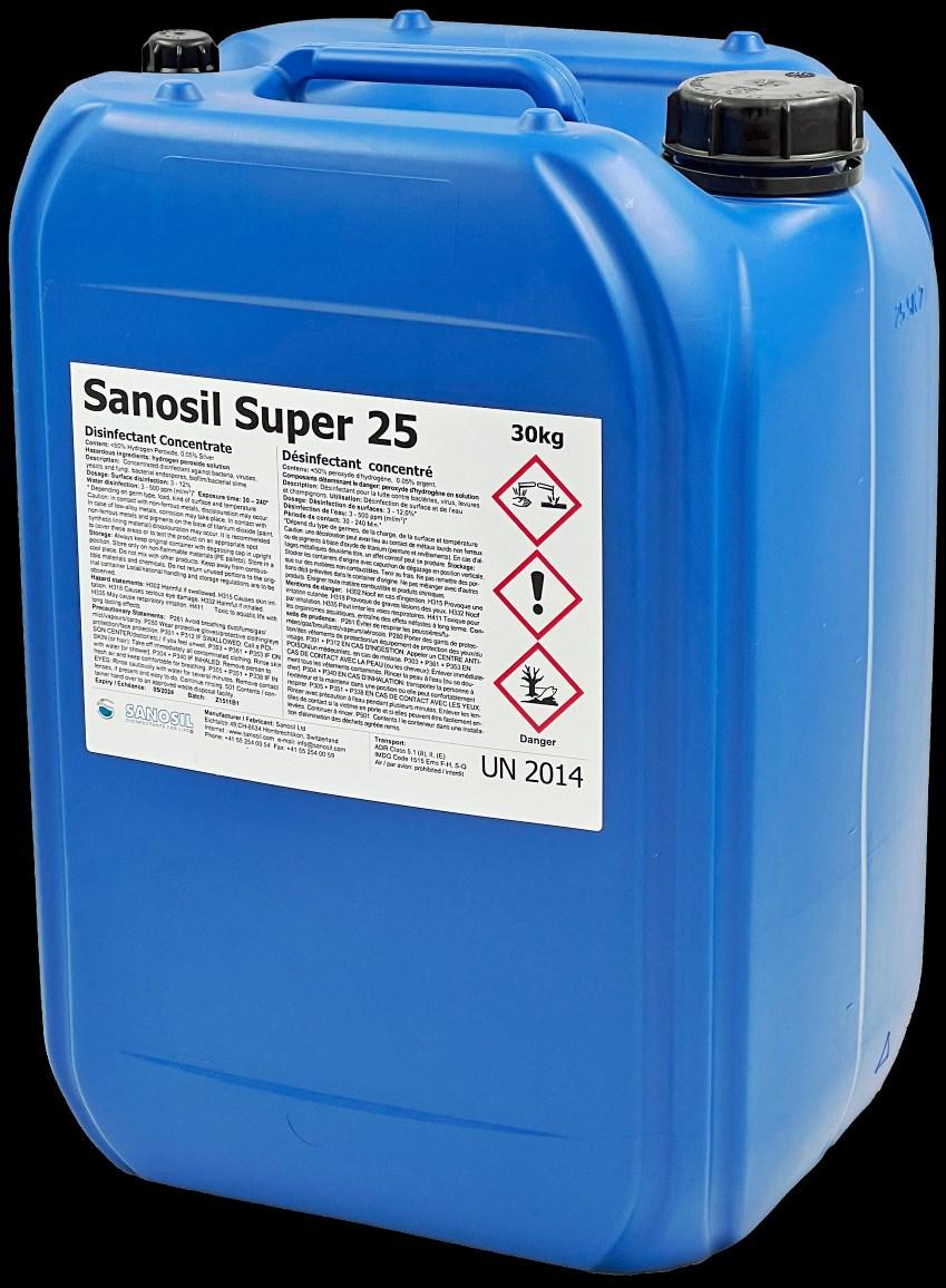 Avant d'utiliser Sanosil Super 25, veuillez lire la fiche de données de sécurité et respecter les indications concernant l'utilisation, le stockage et le transport du produit.