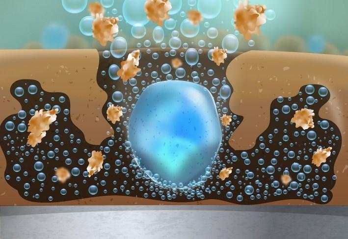 Les biofilms disposent d'une surface relativement dense. La conséquence en est que beaucoup de produits utilisés traditionnellement n'agissent qu'à la surface du biofilm – une grande part du potentiel d'action est ainsi concrètement perdue. Les désinfectants Sanosil disposent, en revanche, d'une stabilisation spéciale. Cela ralentit la décomposition du peroxyde d'hydrogène et permet au principe actif de pénétrer en profondeur dans la structure du mucus. Les bulles d'oxygène actif qui se forment ensuite à l'intérieur du biofilm entraînent également (en plus d'une lutte efficace contre les germes présents) une augmentation du volume au sein-même des structures du mucus. Cela permet de faire éclater puis de décoller les couches de biofilm et fournit des résultats durables.