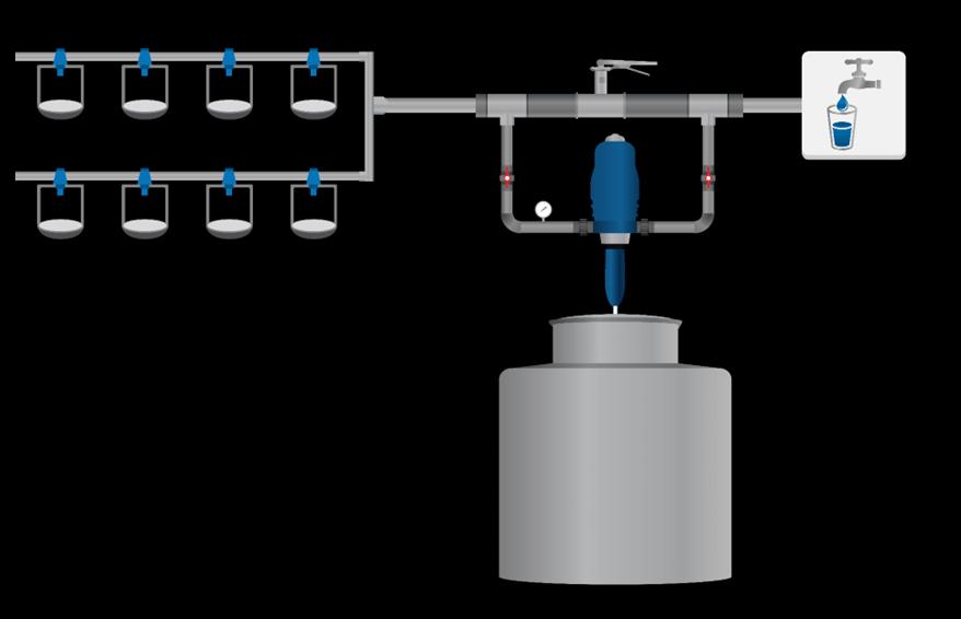 Die Reinigungslösung wird angemischt und das Tränkesystem damit gefüllt. Nach Möglichkeit mit einer Pumpe eine Zirkulation hergestellt. Nach der Einwirkzeit die Reinigungslösung gründlich aus- und nachspülen.