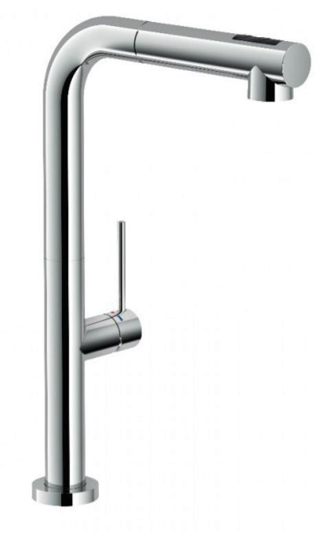 En köksblandare som är höj och sänkbar med utdragbar pip från LH. Vredet monteras i bänkskivan bredvid kranen. En skarp design som gör sig bra på exempelvis framför ett fönster eller på en köksö där en köksblandare önskvärt kan döljas. Finns att beställa i färgen krom.