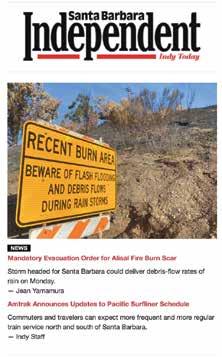 Print subscriptions are available, paid in advance, for $120 per year. Send subscription requests with name and address to subscriptions@independent.com. The contents of the Independent are copyrighted 2023 by the Santa Barbara Independent, Inc. No part may be reproduced without permission from the publisher. The publisher assumes no responsibility for unsolicited material. A stamped, self-addressed envelope must accompany all submissions expected to be returned. The Independent is available on the internet at independent.com. Press run of the Independent is 25,000 copies. Audited certification of circulation is available on request. The Independent is a legal adjudicated newspaper court decree no. 157386. Contact information: 1715 State Street, Santa Barbara, CA 93101 PHONE (805) 965-5205; FAX (805) 965-5518