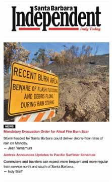 Print subscriptions are available, paid in advance, for $120 per year. Send subscription requests with name and address to subscriptions@independent.com. The contents of the Independent are copyrighted 2023 by the Santa Barbara Independent, Inc. No part may be reproduced without permission from the publisher. The publisher assumes no responsibility for unsolicited material. A stamped, self-addressed envelope must accompany all submissions expected to be returned. The Independent is available on the internet at independent.com. Press run of the Independent is 25,000 copies. Audited certification of circulation is available on request. The Independent is a legal adjudicated newspaper court decree no. 157386. Contact information: 1715 State Street, Santa Barbara, CA 93101 PHONE (805) 965-5205; FAX (805) 965-5518 EMAIL news@independent.com,letters@independent.com,advertising@independent.com Staff email addresses can be found at independent.com/about-us