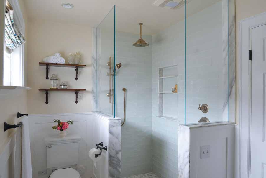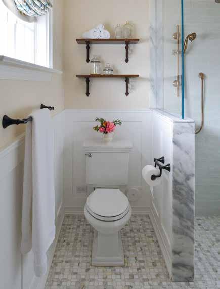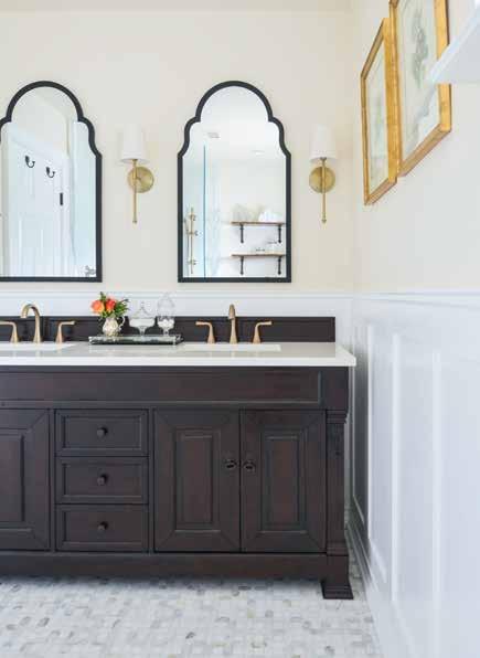 • PLUMBING FIXTURES: Quality faucets and shower systems last longer and feel better to use. Finish also matters, and the champagne bronze pictured here works well with the tile and dark vanity choices. Think of the plumbing fixtures as the jewelry of the bathroom: They make it sing, and it’s one of the first details that catches your eye when you enter the space.