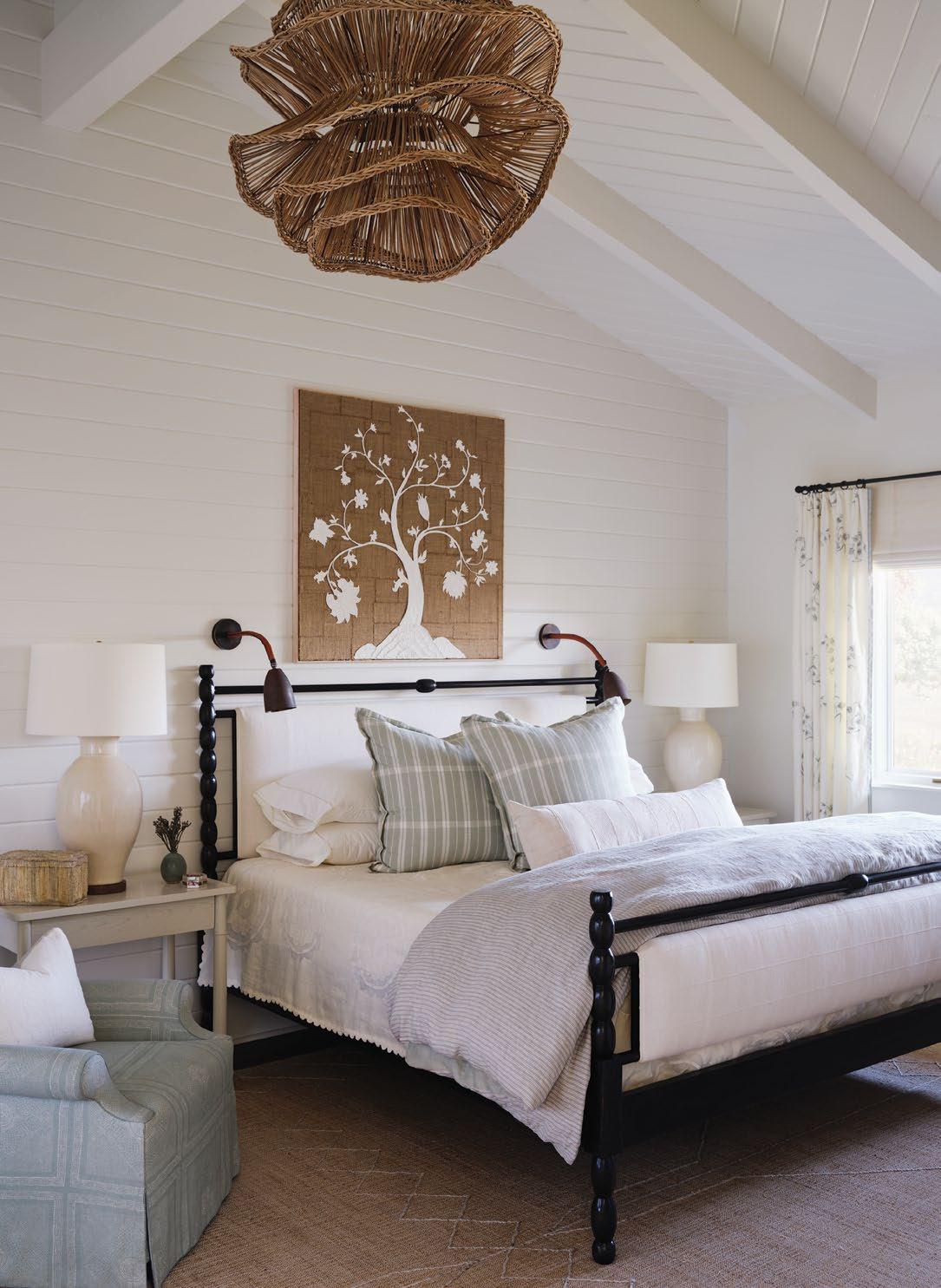 In contrast, the Tree of Life in the primary bedroom is a commissioned plaster-on-burlap artwork by John Matthew Moore of Camden, Maine. “There are a lot of textures in the room,” says De Bastiani: a crackle glaze on the lamp, a big woven light fixture, a grasscloth rug. “When you look at things, they draw you in.”