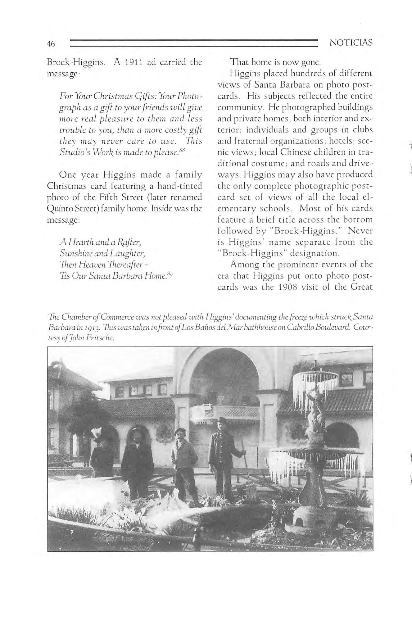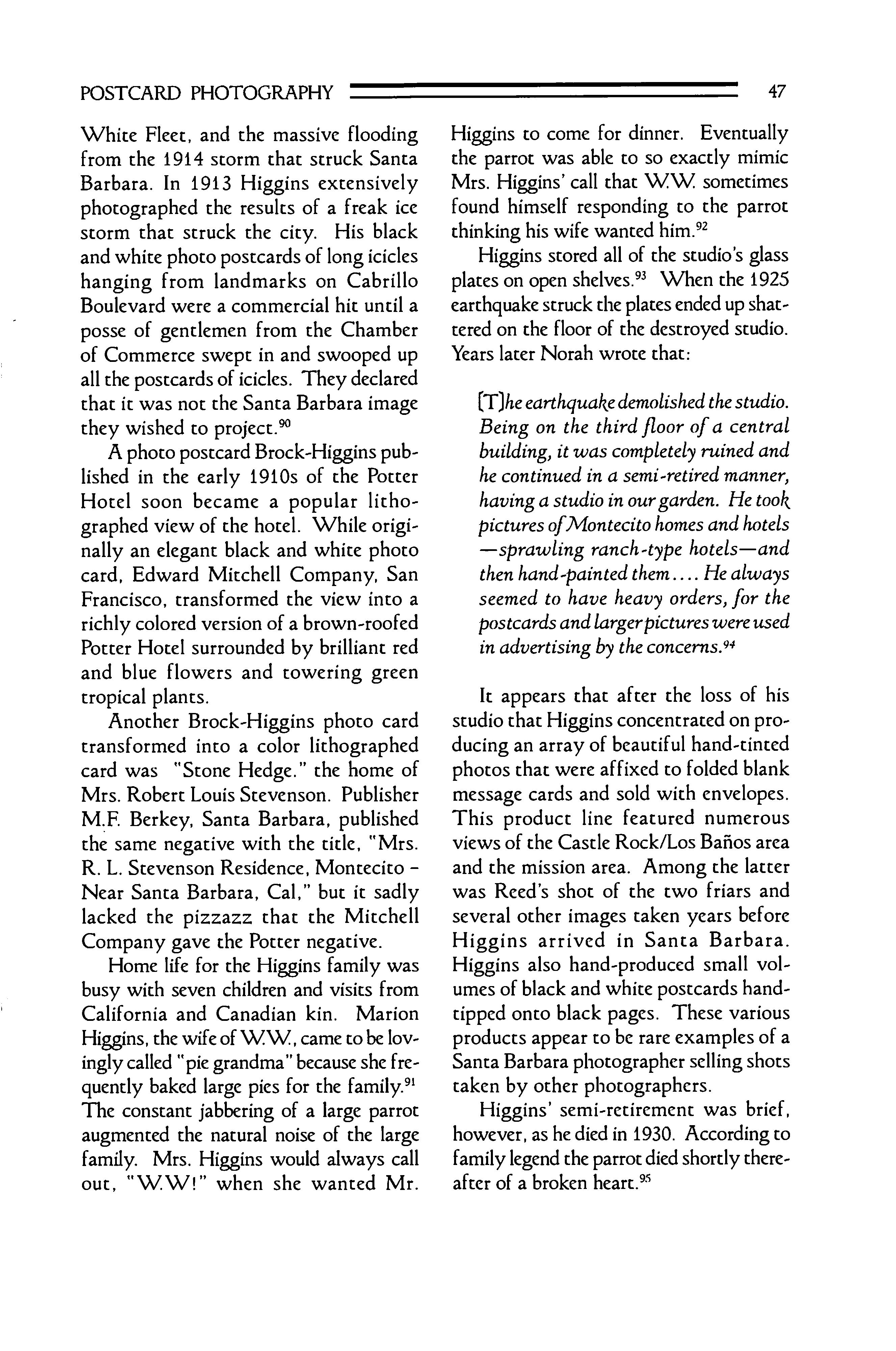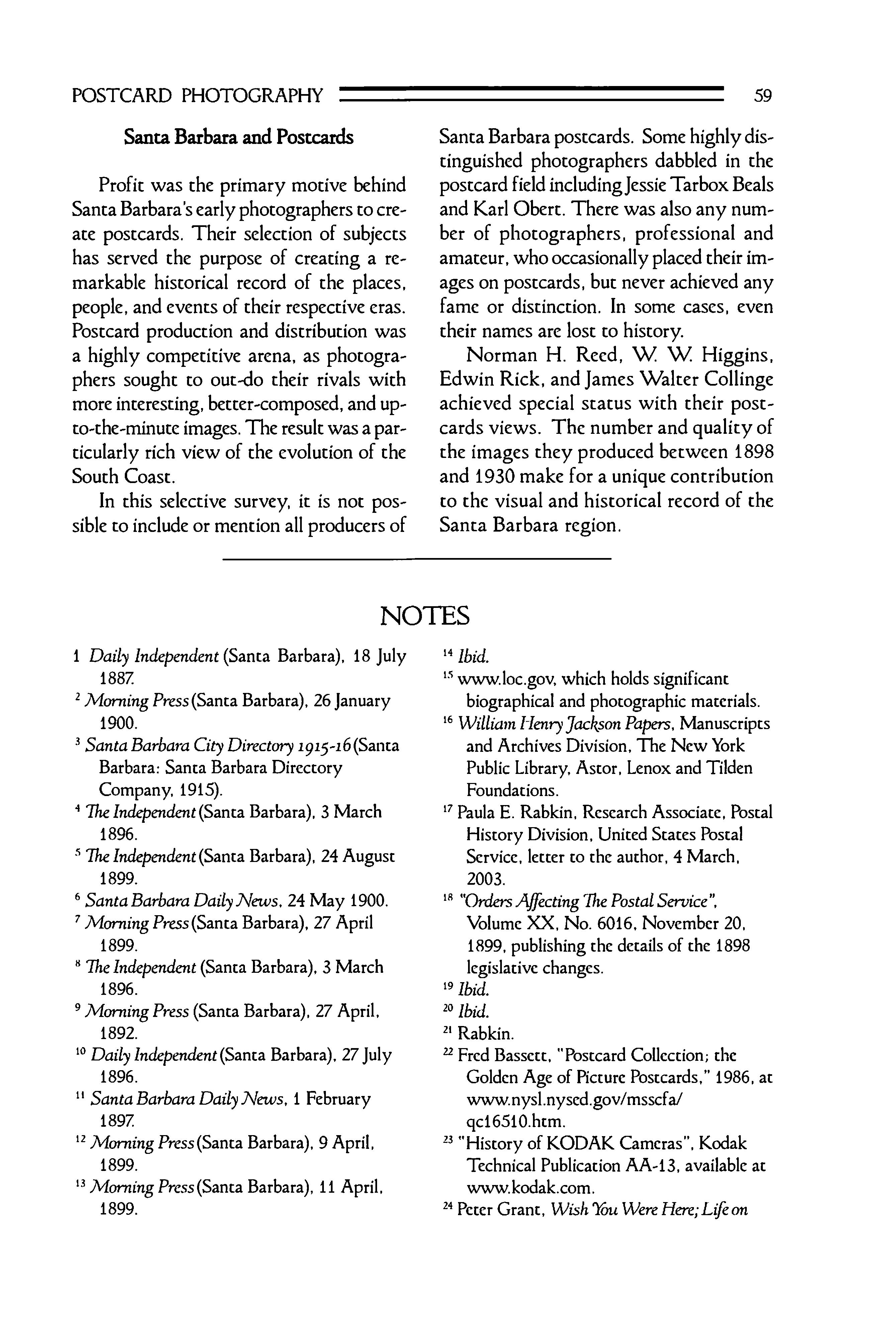There were probably dozens of Santa Barbara photographers who had some oi their work put on postcards, or who took memorable photographs ofSanta Barbara. N.H.Reed,W W Higgins. Edwin Rick, and J. W Collinge arc the principal sub jects of this article because they cower over other photographers in quantity, quality, and duration of their output. Their work spans the period 1888 to the 1960s and in cludes more chan five thousand Santa Bar bara postcard images.