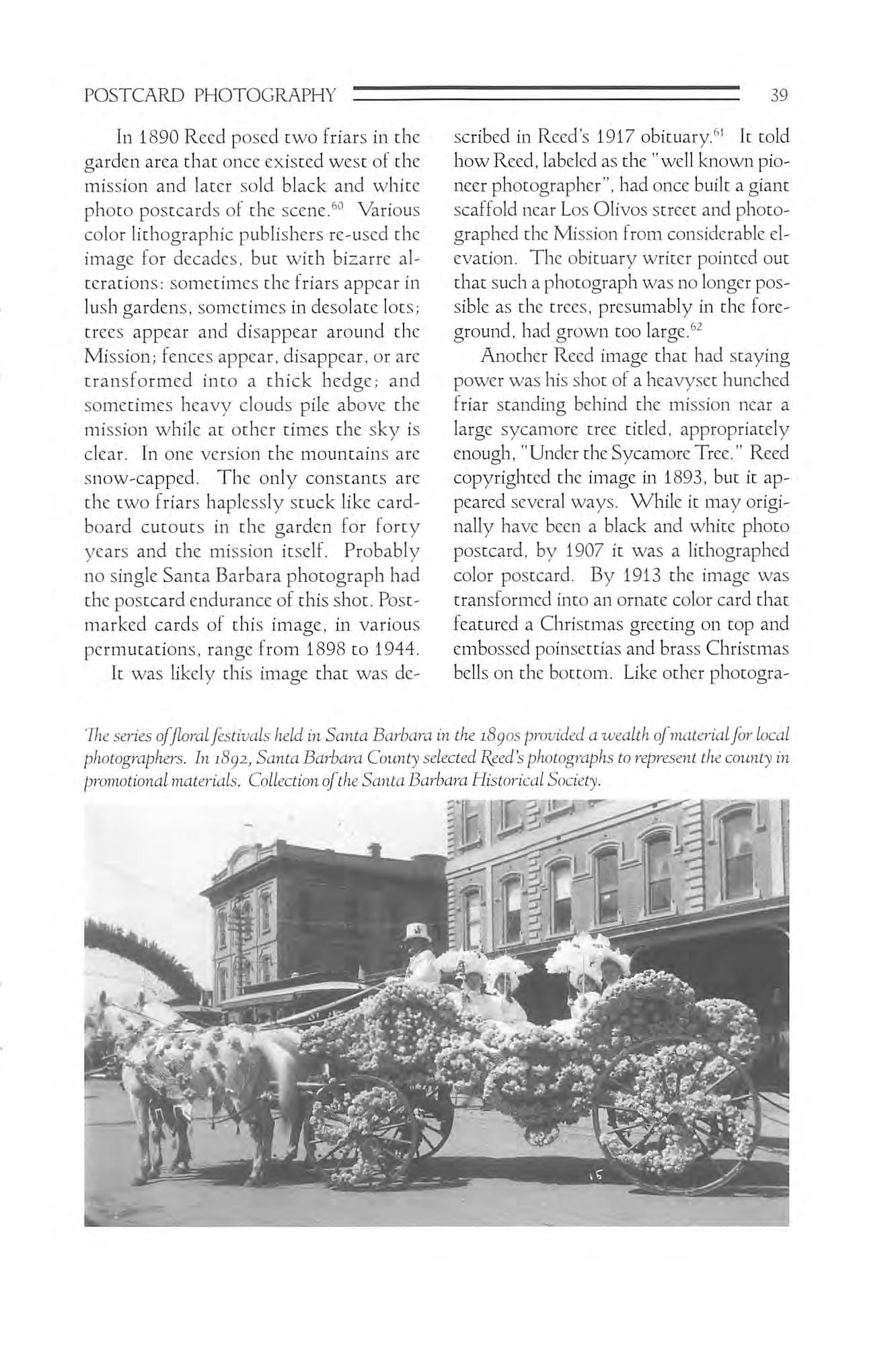 It appears Reed got the better of the competition,as the County chose to pur chase his photographs. County Super visor G. C. Welch used Reed’s photo graphs in Santa Barbara promotional pamphlets distributed across Southern California.^* The Grand Flower Festi val Floral Procession parades and Battles of the Flowers were so popular that com petitors’ cash prizes grew from $940 in 1892^2 ^^ 300 in 1896.^^ The masterful professional managementReed displayed in having a total of six pho tographers, including himself, working the parade and taking an amazing total of two hundred photographs with large, cumbersome cameras must have helped establish him as the premier business man-photographer of Santa Barbara.
