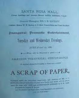 ture. In 1875, the first dramatic performance at Lobero’s theatre was staged by the Denin-Sawtelle Troupe, which presented a series of plays typical of the times including Rosedale and Rip Van Winkle. 5 In 1888, the young people of the town formed the Amateur Club and produced and starred in a series of plays starting with Sardou’s A Scrap of Paper. This play inaugurated the new Santa Rosa Hall, which had a stage and auditorium and stood on the corner of Anacapa and Arrellaga streets.6