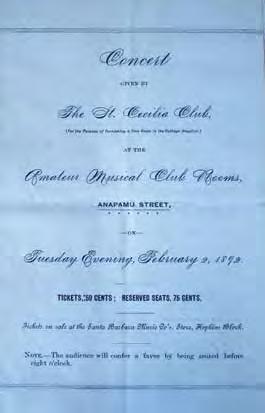 The year 1891 marked the formation of the St. Cecilia Club, a charitable organization that raised funds for hospital expenses. Initially, they planned to give a series of concerts to raise needed funds for medical expenses, and their first foray was a cantata inspired by Alfred Lord Tennyson’s “The Lady of Shalott.” Elizabeth Eaton Burton, first president of the organization, arranged to have the score sent to Santa Barbara from London for the February 2, 1892 performance. (From scrapbook belonging to Elizabeth Eaton Burton; courtesy of Jean Hunt)
