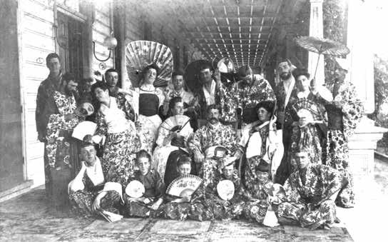 In 1887, the young people of the town borrowed costumes from a traveling troupe performing Gilbert and Sullivan’s Mikado, and held a Mikado party at the Arlington Hotel (site of today’s Arlington Theatre). Among the group were the future stars of the Amateur Club performances. Back row, third from left, stands Nathalie Anderson Sawyer, whose amateur acting career would last through the 1920s when she performed with the Community Arts Players. (Santa Barbara Historical Museum)