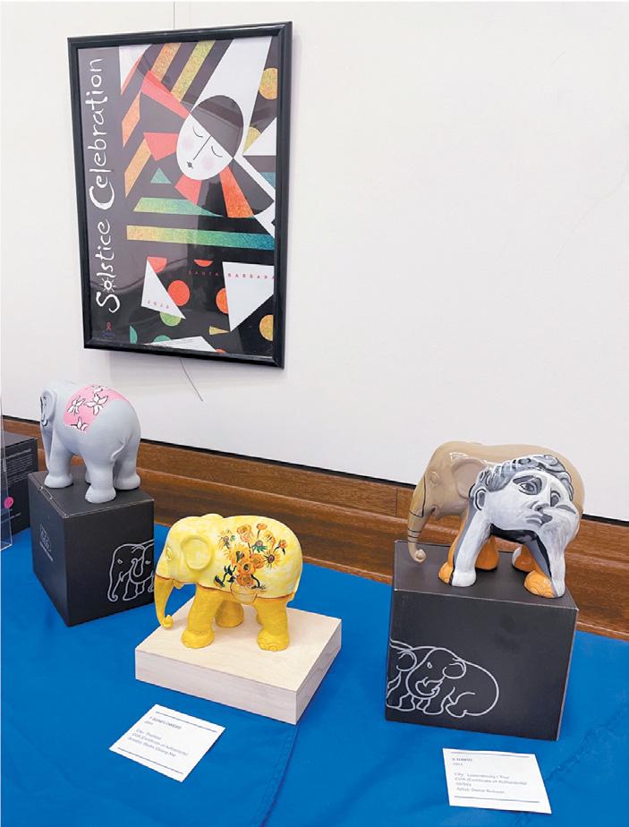 Elephants on Parade – While Disney only had pink pachyderms in that famous psychedelic sequence from 1941’s Dumbo film, Santa Barbara’s Summer Solstice organization’s Little Elephant Parade features an entire herd of 60 whimsically painted, albeit small elephants created by local artists, a special event that ends a week of activities today. The invited artists – sponsored by a local business, organization, or community supporter – transformed miniature elephant sculptures into one-of-akind hand-painted works of art. All 80 have been on display at Son y Sabor since last weekend, and will today “parade” up State Street to Community Environmental Council’s Hub for a Trunk Show and auction at a final party for the painted pachyderms. The critters will be auctioned off, with 20% going to elephant conservation and Elephant Parade® international, 10% for the artists, and the remaining funds supporting the Solstice Celebration and workshop. The event will also feature the announcement of the winner of the Solstice 2026 Poster Art Contest, inspired by this year’s parade theme of “Wave,” after a final chance to view the more than two dozen original submissions by local artists of the design that will also appear on tee shirts over the June Solstice weekend. Visitors can also enjoy libations and listen to the guitar stylings of Magic Jordan and beats by longtime Solstice DJ Darla Bea, now the organization’s newest board member.