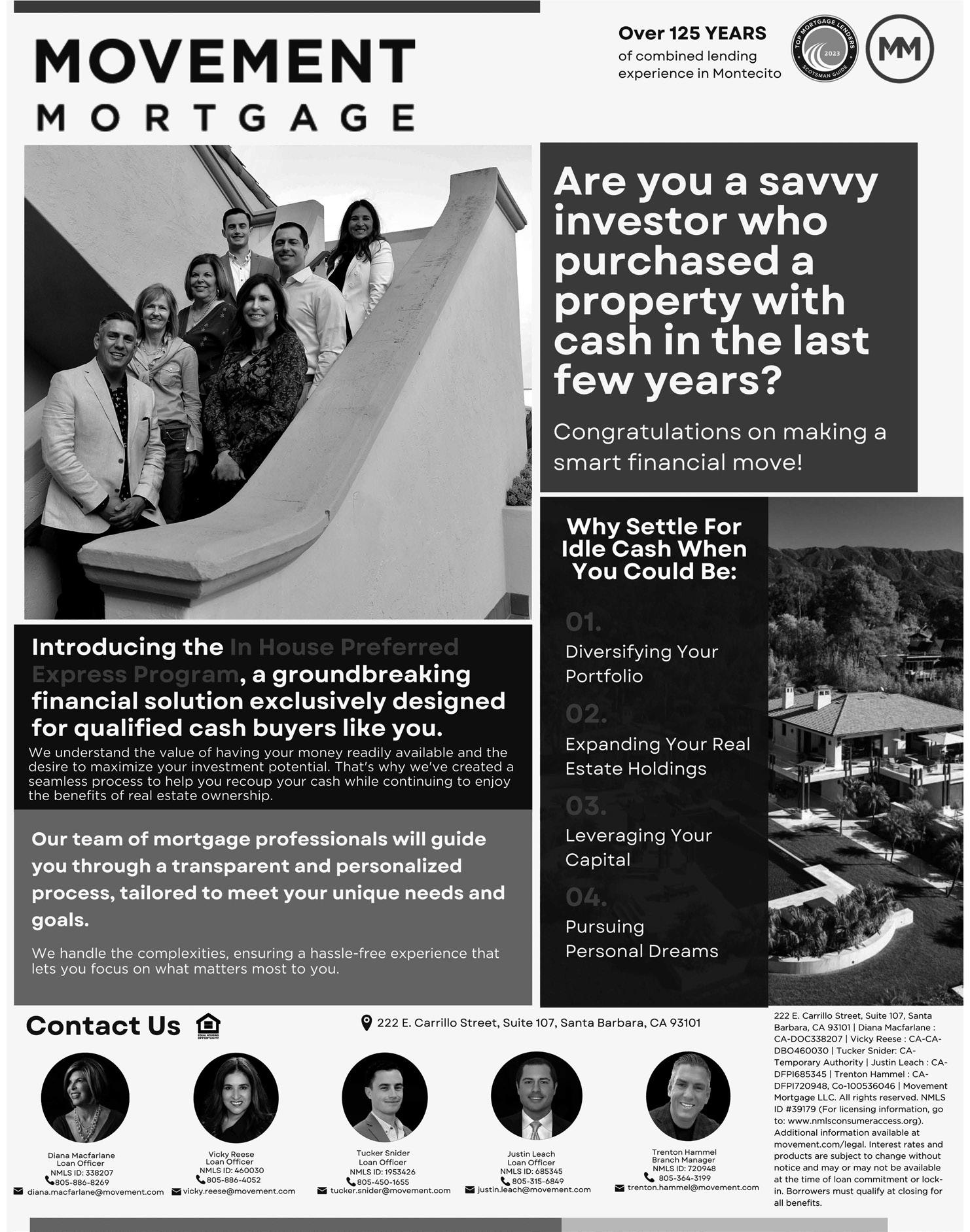 REAL ESTATES SUMMER 2023 Montecito JOURNAL 53 montecito.bank/mortgage • (805) 963-7511 Mortgage & Home Lending Fixed & Adjustable Rates Online Application Loans up to $5 million* Purchase & Refinance *Subject to credit approval 2022 Best Mortgage Company - SB Independent 25 Best Bank Awards in 10 Years NMLS ID#: 472185 We’re the key to homeownership. Apply Today Buying a house can be one of the happiest events of your life! Montecito Bank & Trust offers you the financing options to make that new home a reality!