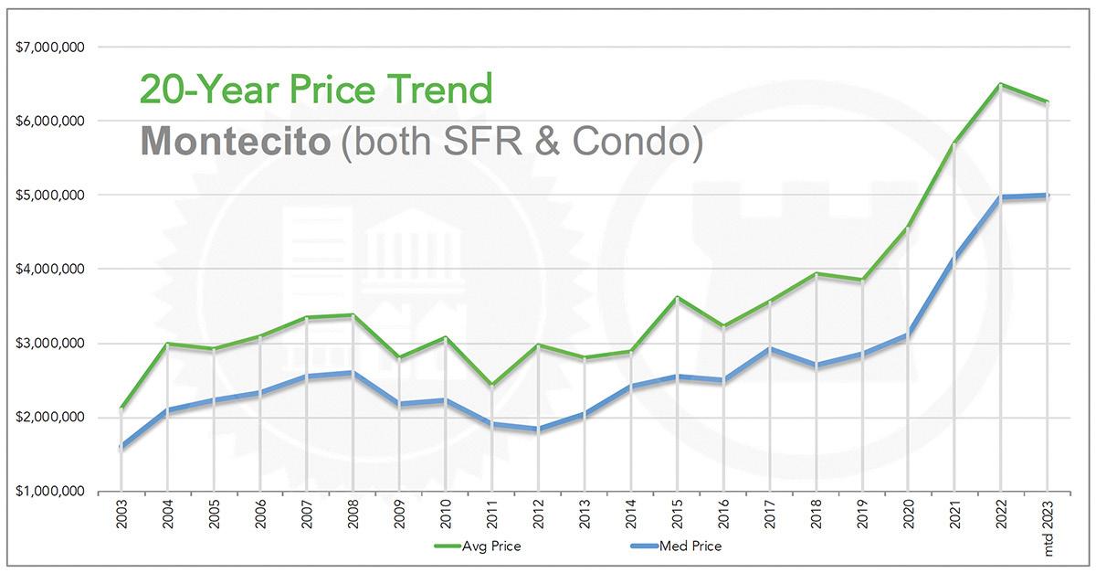 The numbers are in for the first half of 2023, and the Santa Barbara South Coast real estate market remains tight in terms of inventory and well in favor of sellers, as there is simply more buyer demand than homes available for sale. Accordingly, the number of sales is down 32% over last year, with just 370 homes and PUDs sold in South County Santa Barbara yearto-date. This is the lowest number of properties we’ve seen change hands in the first half of the year, since 2009! Normally by the end of Q2, we would expect to see the number of sales in the mid 500-range.