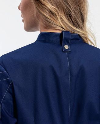1 | Damen-Kochjacke Regular Fit 5417 Jeansjackenstyle, Metall-Druckknöpfe mit Logo, 2 aufgesetzte Pattentaschen, Krempelarm, Armtasche mit Logo, Lüftungslöcher, Kontrastnähte, Passe im Rücken, Schürzenschlaufe am Kragen.