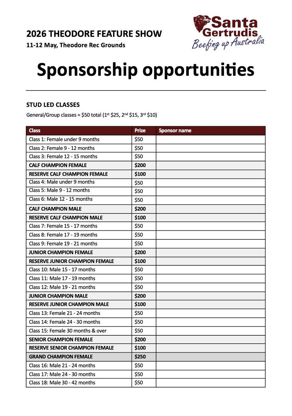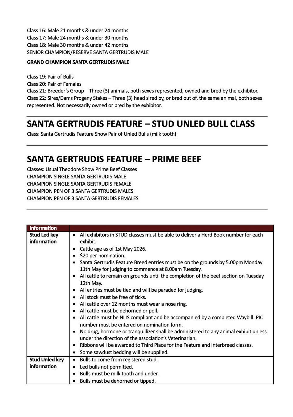 WiththeFeatureBreedShownowsetfor Tuesday,May12,timedtocapturethestrong daytwoattendance,theeventprovides outstandingexposureformembersandthe breedalike.Furtherinformationandsponsorship opportunitiesareincludedinthisissueofSanta Express.TosponsoraclasscontactMember SupportCoordinator,WendyJamesadmin@santagertrudis.com.auorphone07 32162708.