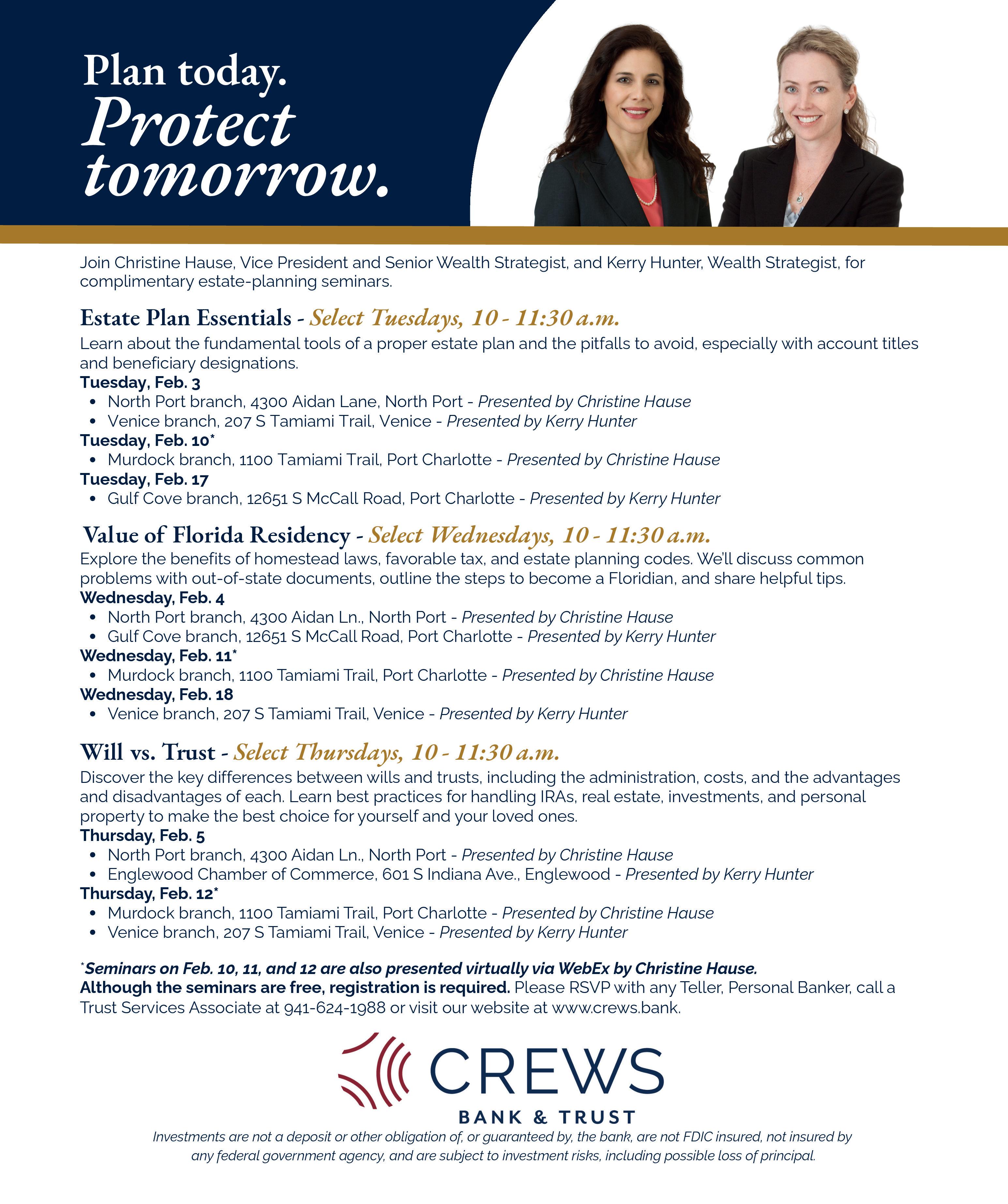 The Florida Department of Health in Charlotte County invites parents, expecting parents, grandparents, legal guardians and caretakers to attend its free Child Safety and Wellness Workshops, offered in person on Thursdays, February 5 and February 12, 3:30 to 5pm, at the Ann and Chuck Dever Regional Park Recreation Center, 6961 San Casa Drive. The workshops focus on child passenger safety with certified technicians available to check car seat installation, pool and water safety, family nutrition, and safe sleep practices for infants. Free pack and plays and car seats are available for qualifying participants while supplies last; online participants must call 941•624•7200 to inquire about safety items. This class is also offered online on Tuesday, February 10, 6 to 7pm.Registration is required at surveymonkey.com/r/ childwellnessclass.