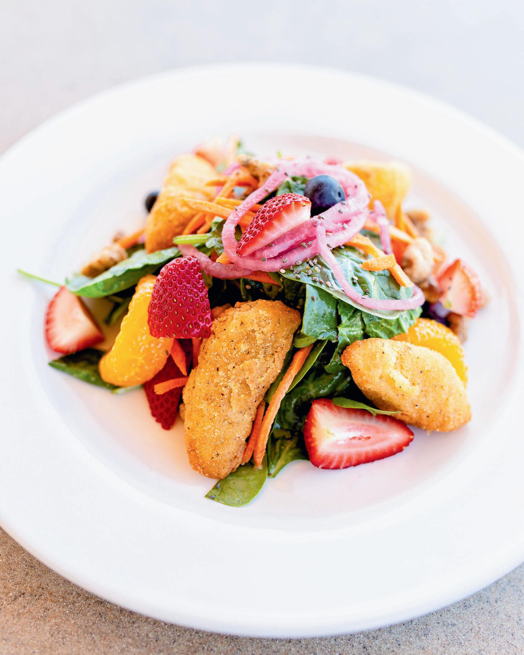 spinach, mixed berries, candied walnuts, carrots, tomatoes, feta cheese, with house-made white balsamic dressing