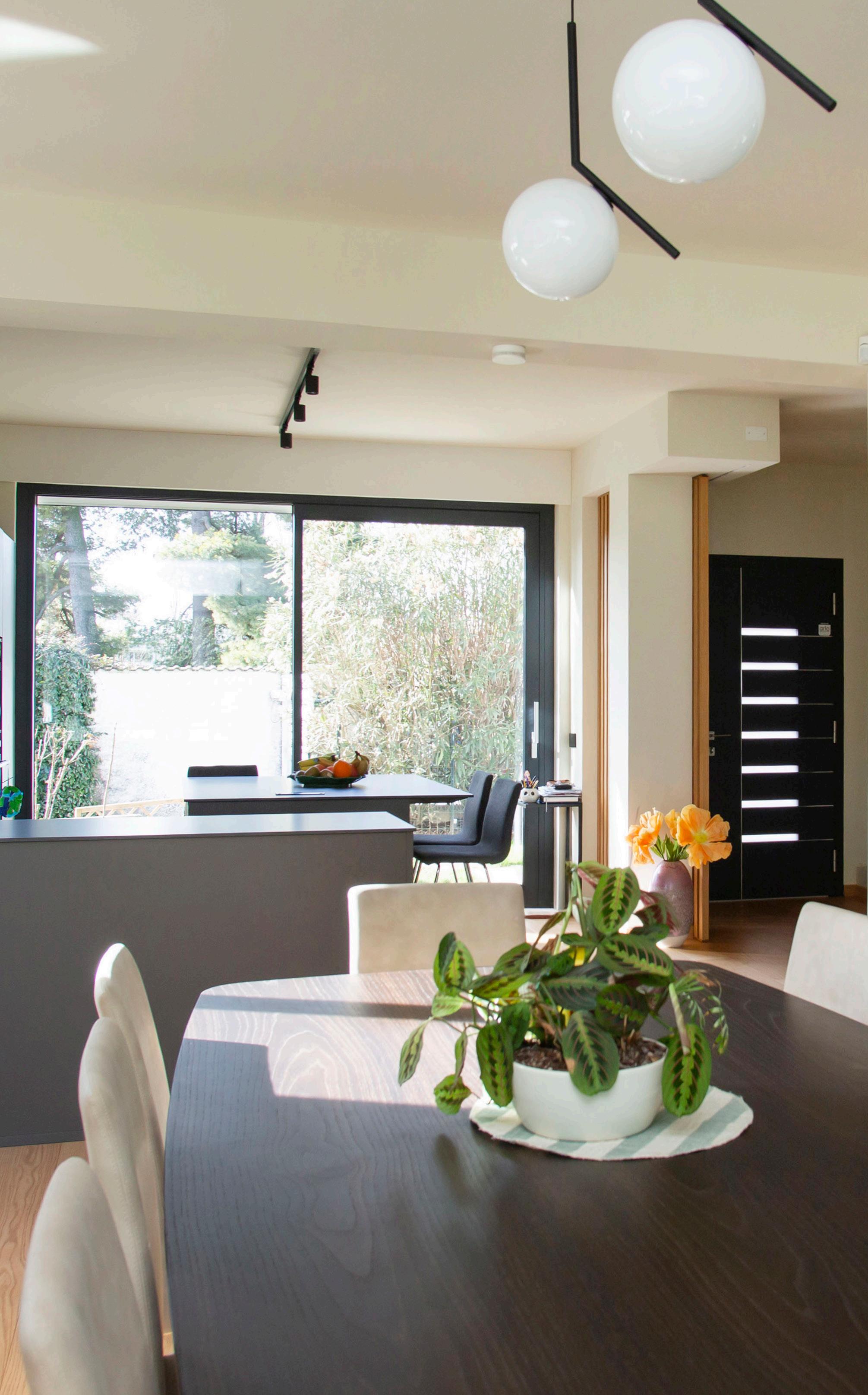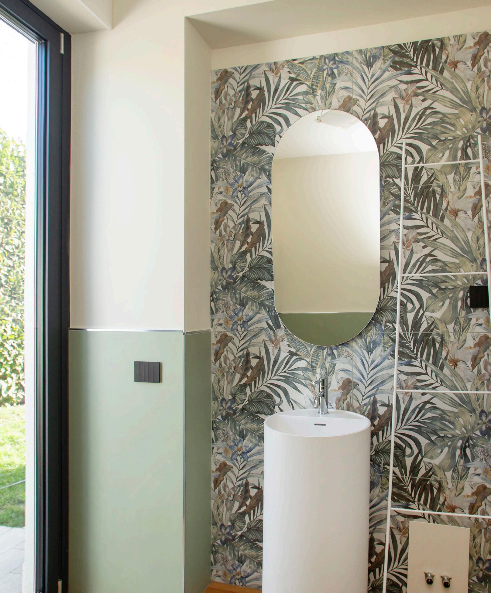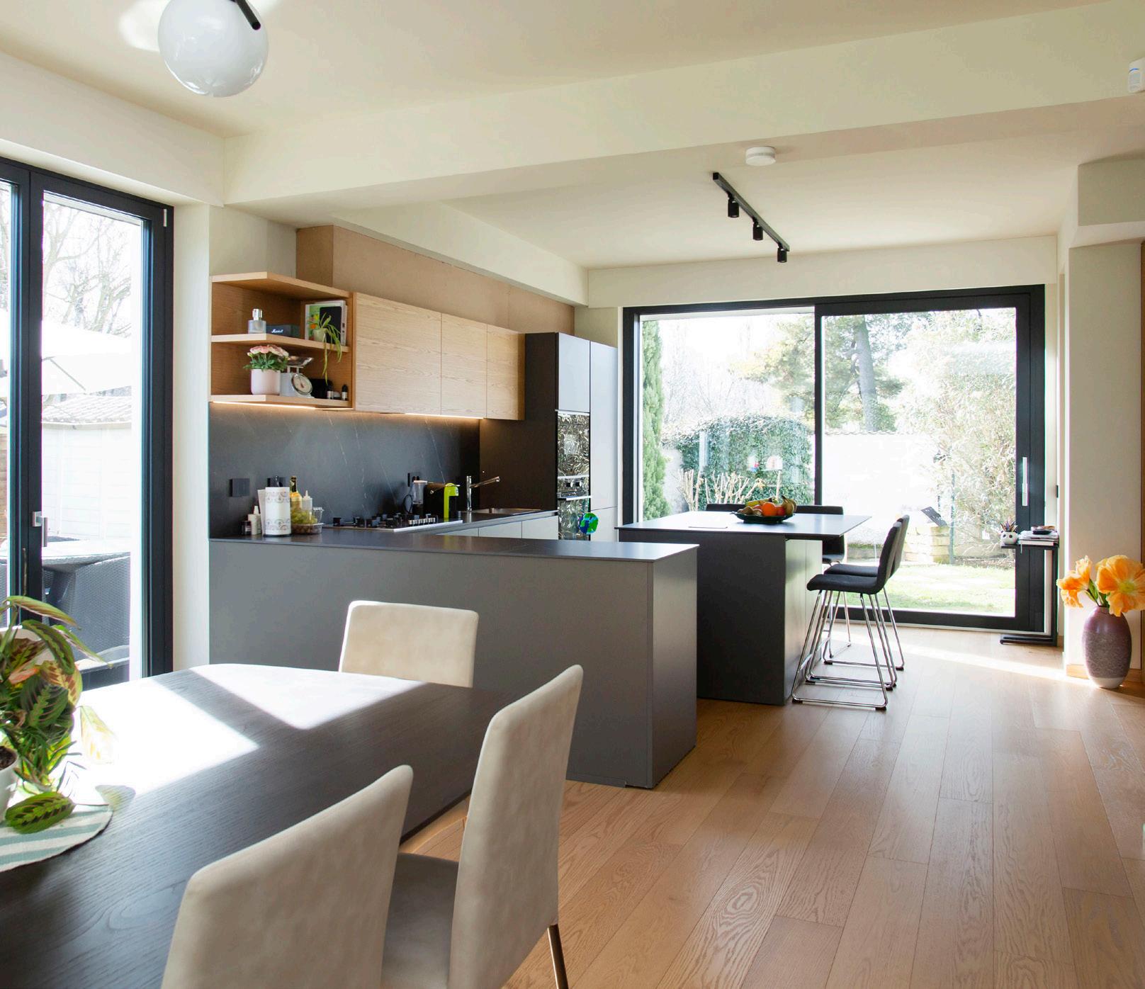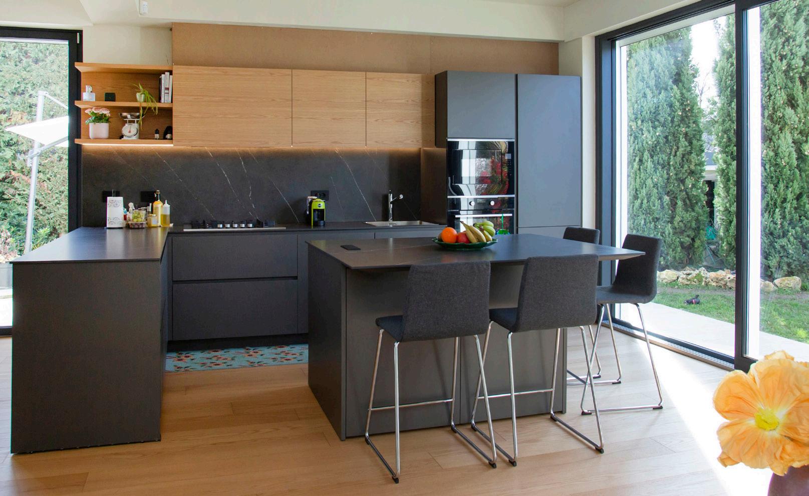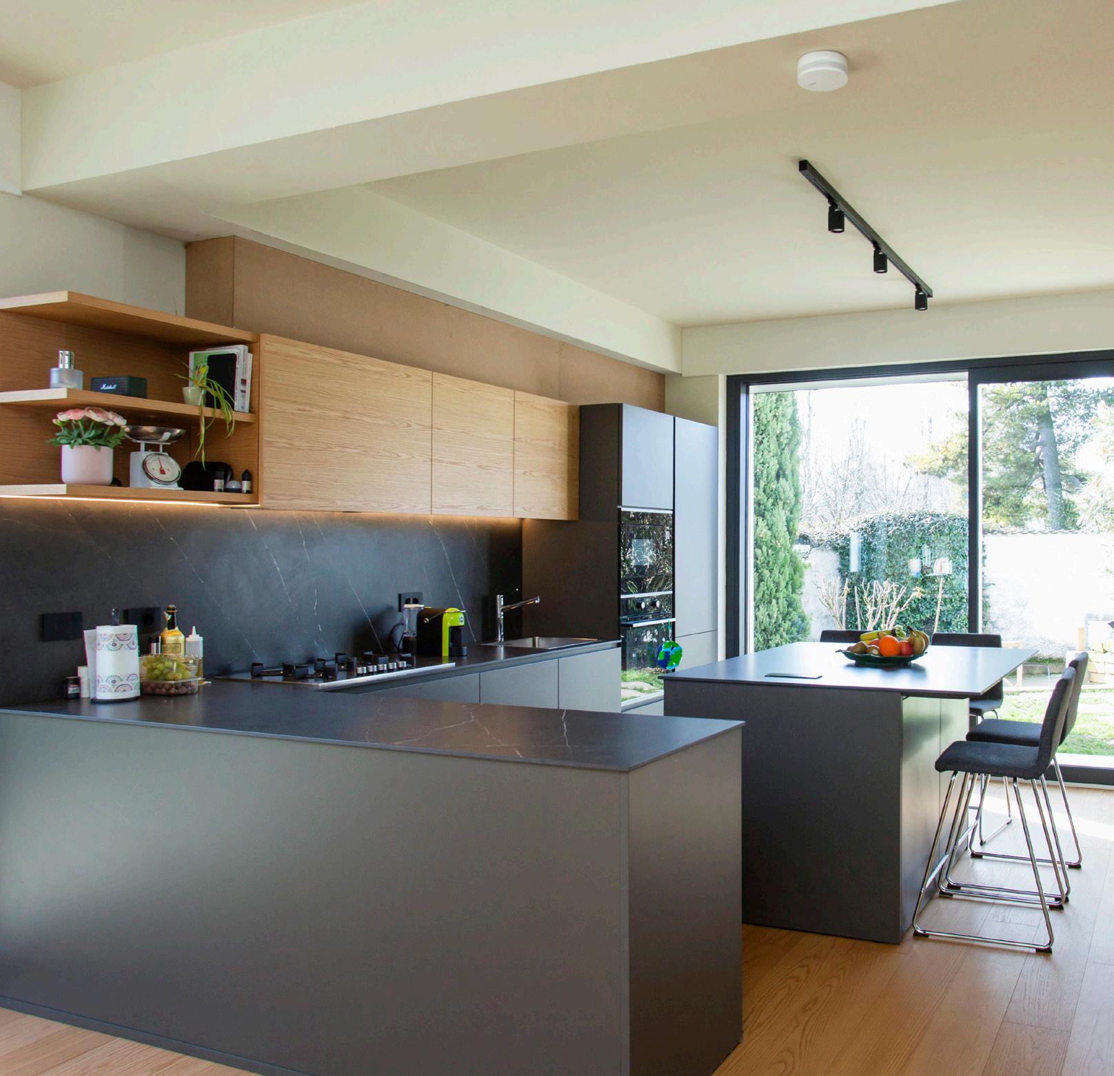 La cucina di design, aperta sulla zona giorno, definisce uno spazio contemporaneo e conviviale. È una scelta che rende la casa più sociale e più fluida, ideale per chi ama cucinare senza separarsi dal resto dell’ambiente. La composizione è pensata per un uso quotidiano comodo, ma anche per ricevere: colazioni veloci, pranzi informali, cene tra amici che si spostano naturalmente tra cucina, soggiorno e giardino.