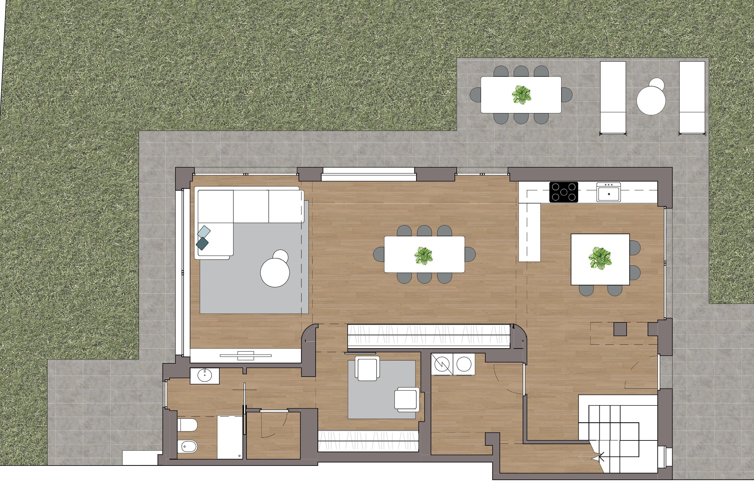 Il soggiorno è accogliente e progettato per essere vissuto con naturalezza: un ambiente caldo, luminoso, pensato per la convivialità e per il relax quotidiano. La relazione con l’esterno è uno dei suoi punti forti: il giardino diventa un’estensione immediata della zona living, rendendo semplice aprire la casa nelle belle stagioni e ritrovare privacy all’aperto. È la classica zona giorno che funziona bene sempre, perché unisce ampiezza e misura.